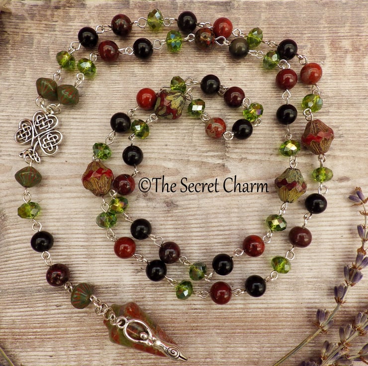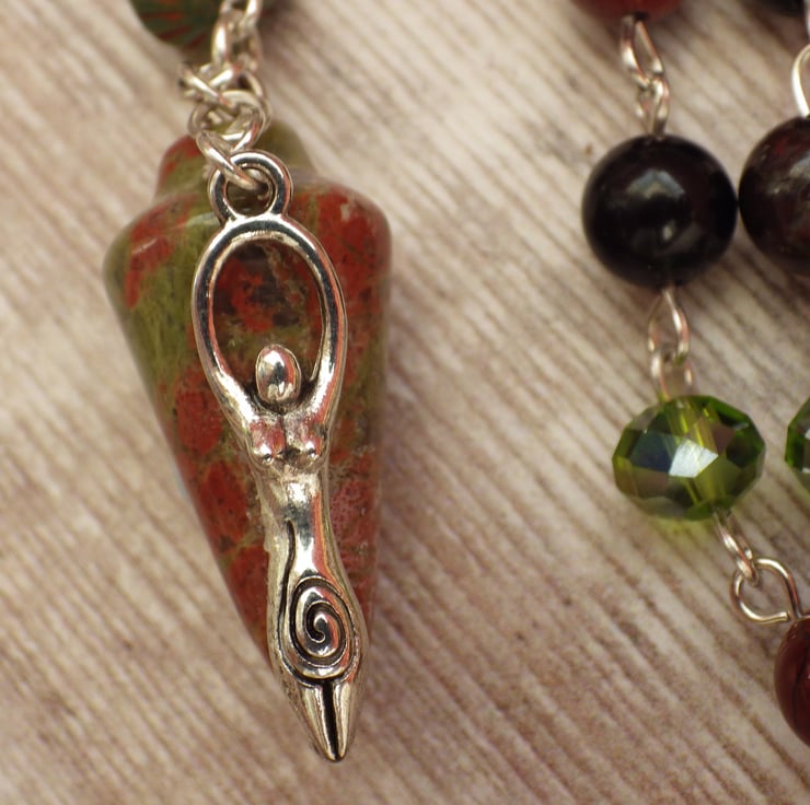 This necklace measures 31" (79cm) around, with an additional drop of 5" (13cm) from the top of the tree of life to the bottom of the unakite Goddess pendant.