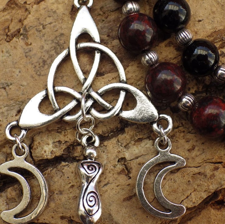 The crystals at the end of the strand represent the triple goddess, mother, maiden and crone.