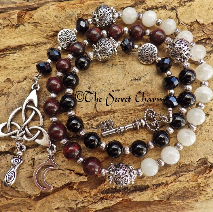 Hecate hangs with 2 crescent moons from one end of the prayer beads, with a silver key hanging from the other.