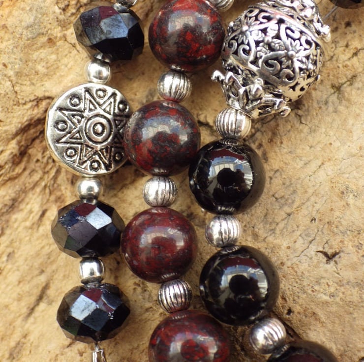 These striking prayer beads are 25" (62cm) long and have been handmade with poppy jasper, rainbow moonstone, black obsidian, jet black crystals and silver filigree orbs with Hekate, Goddess of witchcraft in mind. Goddess of wild places, she is closely associated with magic.