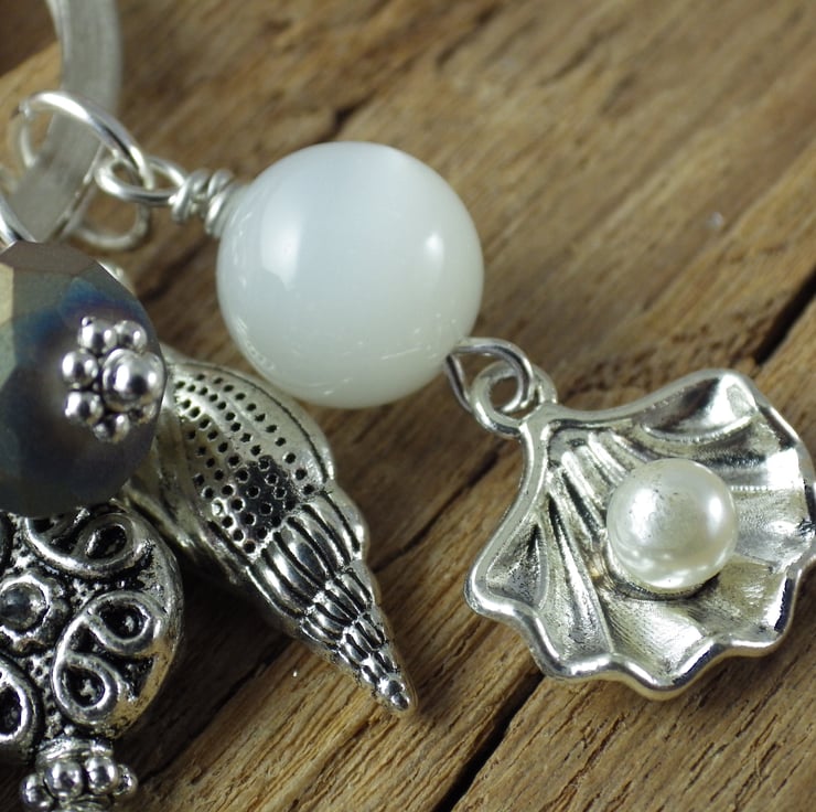 6 different charms - conch shell, cup, sea Goddess, starfish, crescent moon, oyster shell