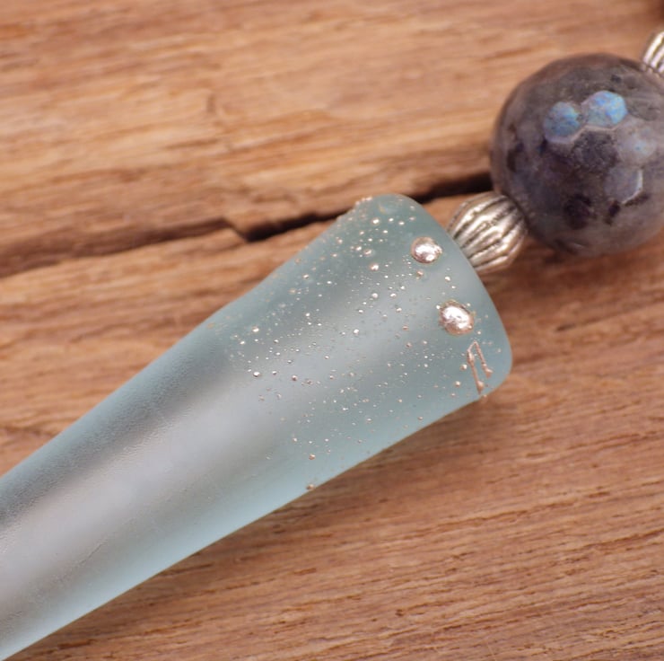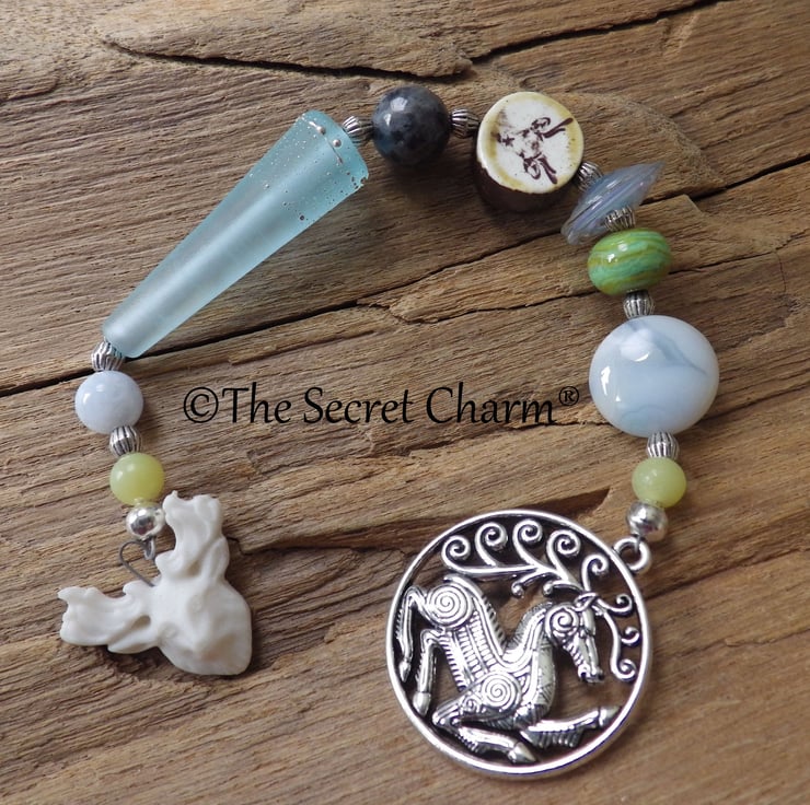 The strong feminine energies of this piece are amplified by the inclusion of handmade beads & pendants of lampwork glass and ceramic by female artisans in the US and the UK.