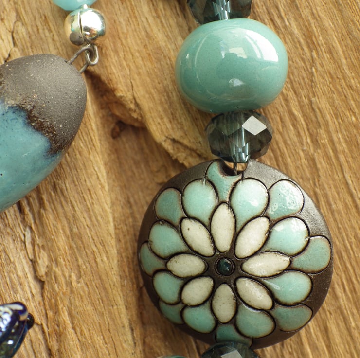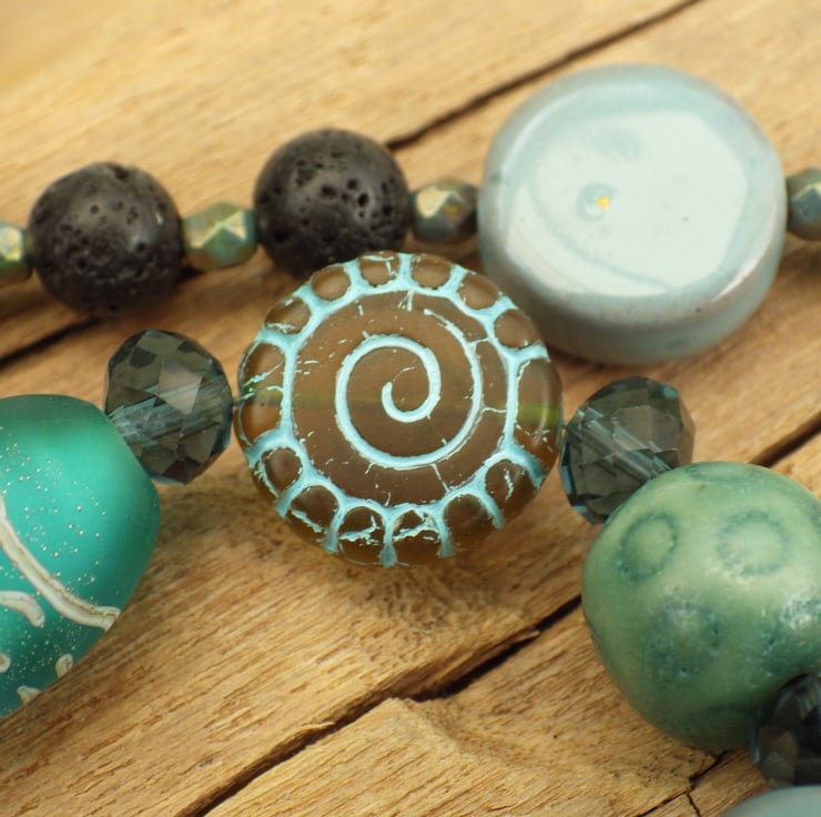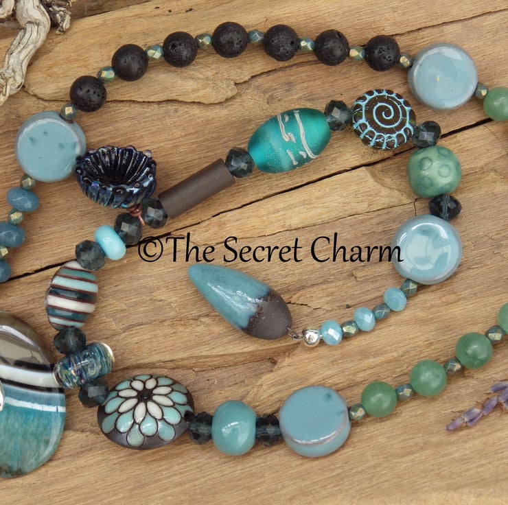 Handmade with aquamarine gemstones, green aventurine gemstones, black lava rock, crystals, a druzy quartz geode pendant, sterling silver Goddess, artisan lampwork glass and artisan ceramics.