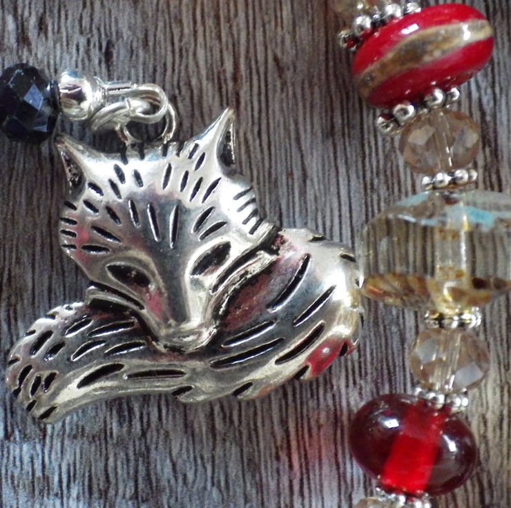 The strong feminine energies of this piece are amplified by the inclusion of handmade lampwork glass beads and a fox pendant all by female artisans from the US and the UK.