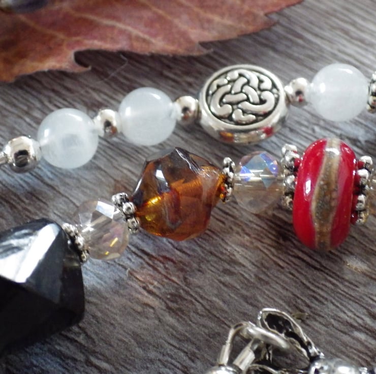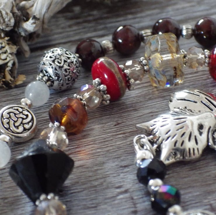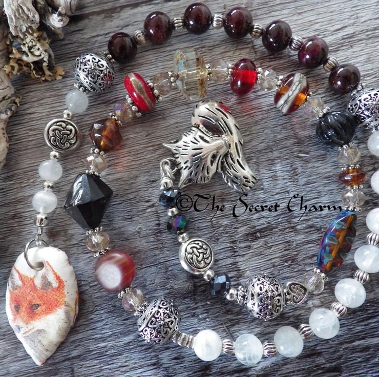 These pagan prayer beads are 22" (55cm) long and have been handmade with rainbow moonstones, garnet gemstones, Czech crystals, artisan lampwork and antiqued silver filigree with the Celtic fox in mind.