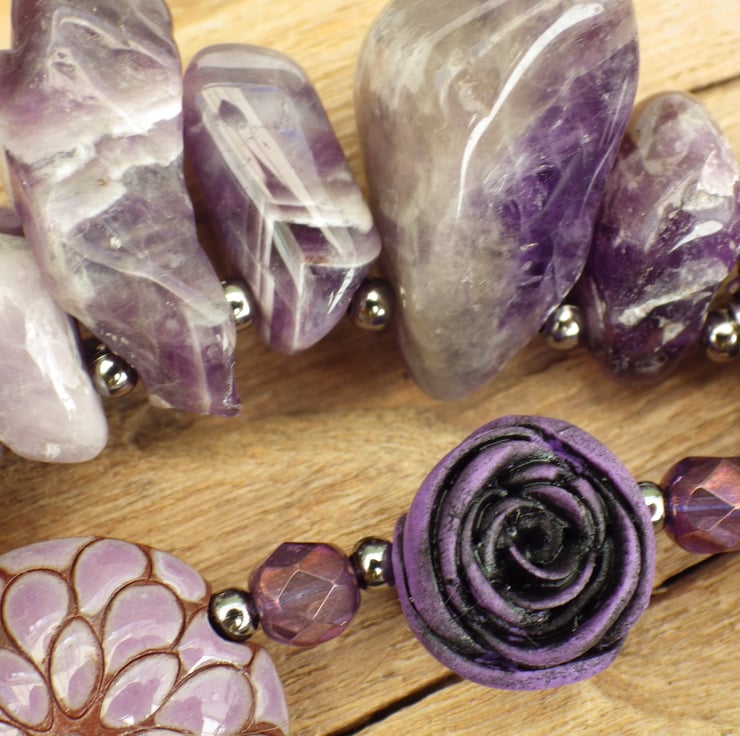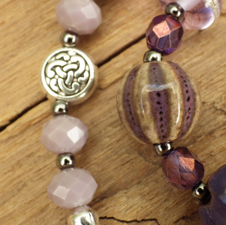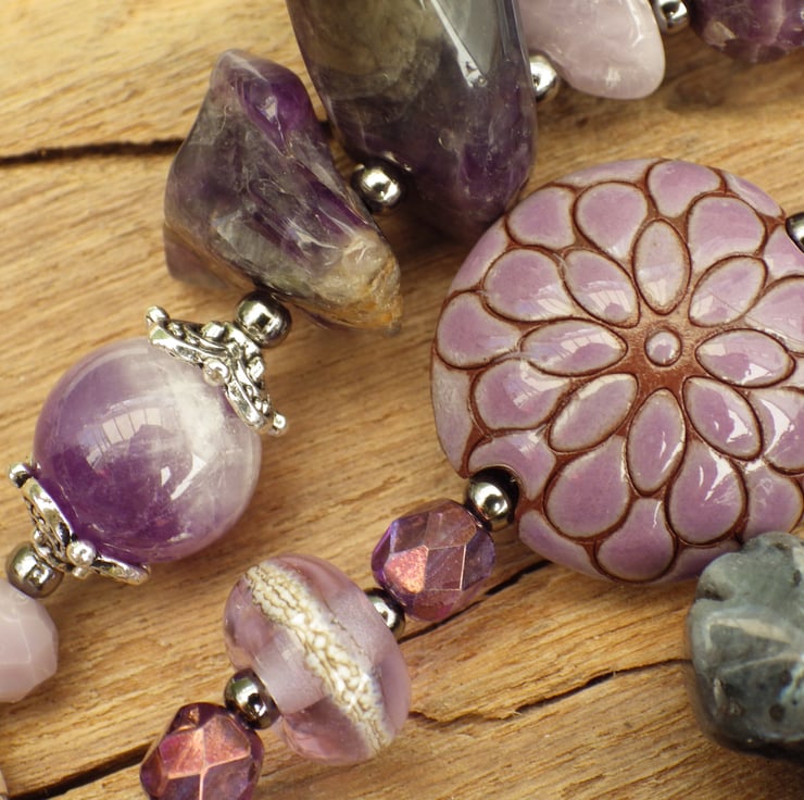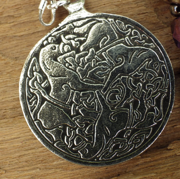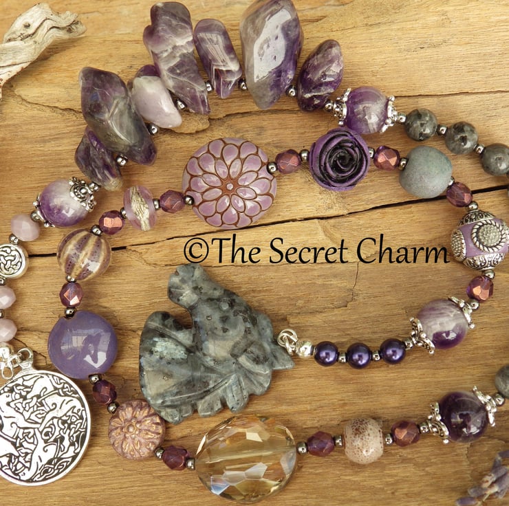 These special Celtic triple horse Goddess Epona pagan prayer beads are 25" (62cm) long and have been handmade with purple amethyst gemstones, labradorite gemstones, faceted crystals, art beads, artisan ceramic beads, glass pearls and artisan lampwork glass.