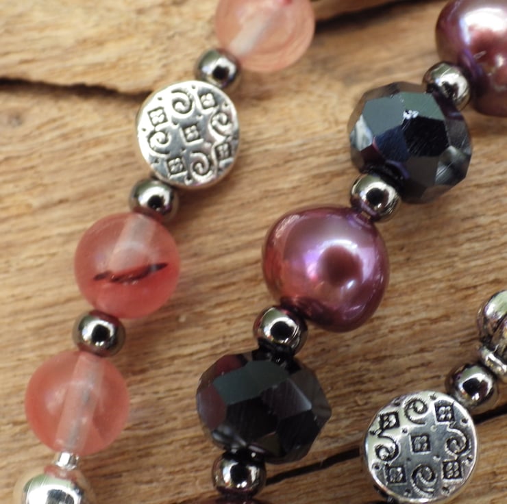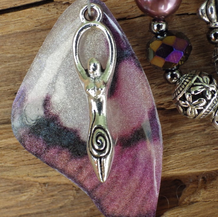 Handmade with rose quartz, watermelon tourmaline, amethyst, lilac freshwater pearls, jet black crystals, silver filigree orbs, a pewter Goddess and an artisan wing with Goddess Lilith in mind.