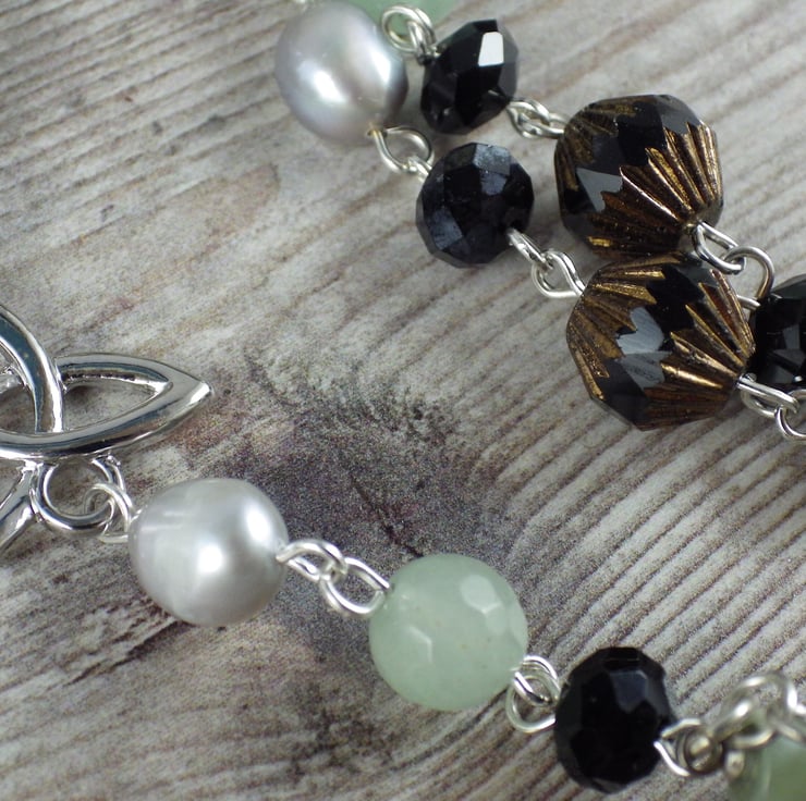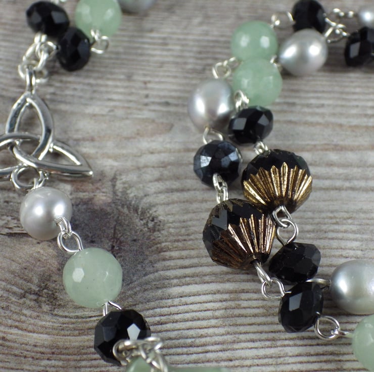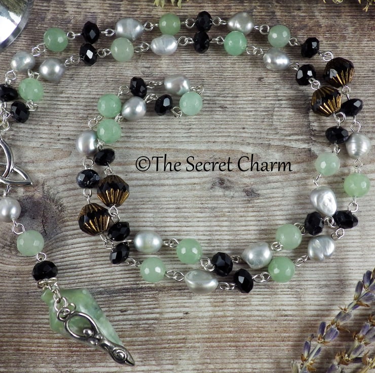 This gemstone necklace has been handmade using 8mm aventurine gemstones, grey freshwater pearls, peace jade and black Czech crystals with Hekate, Goddess of witchcraft in mind. Goddess of wild places, she is closely associated with magic.