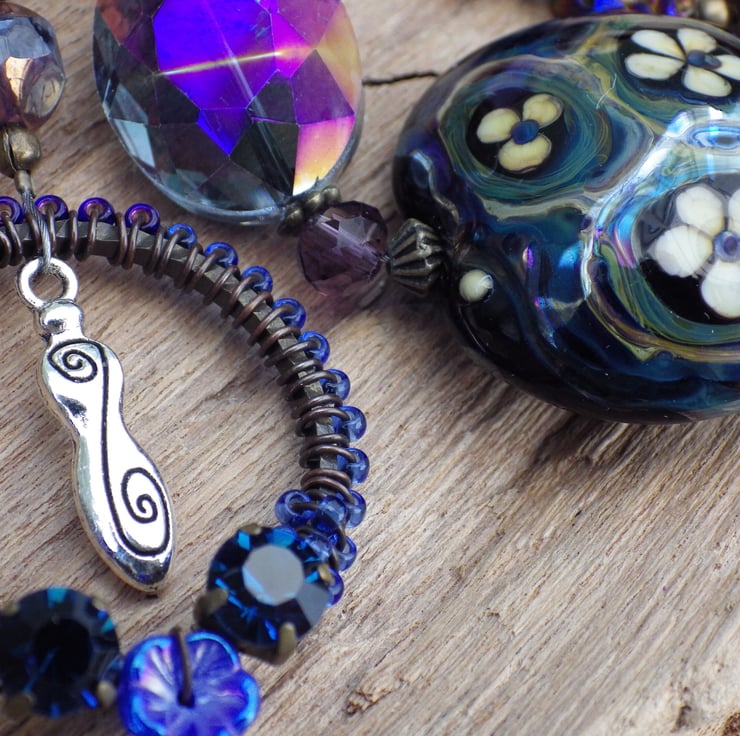 The strong feminine energies of this piece are amplified by the inclusion of handmade lampwork glass beads and a rhinestone ring by female artisans. There are some truly beautiful pieces of work included in this strand.