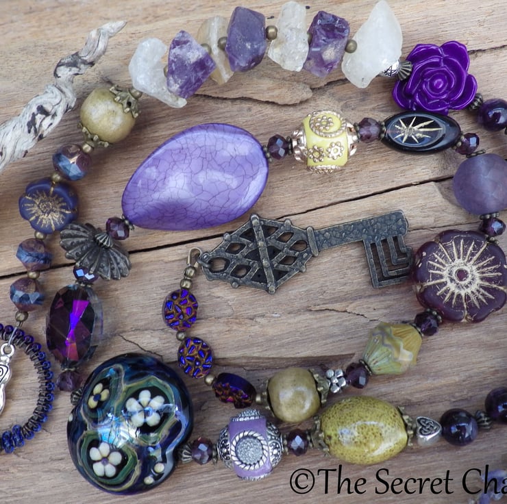 These meditation beads have been created using raw amethyst and citrine chunks, amethyst gemstones, titanium plated hematite, art beads, crystals, wooden beads, and artisan lampwork glass. A little silver pentacle bead, Celtic knot heart and little flower feature along the strand.