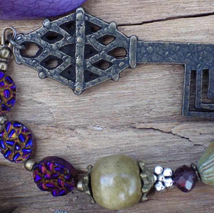 A silver Goddess Hekate surrounded by an artisan rhinestone beaded ring (32x35mm) adorns one end of the beads with a beautiful genuine ornate vintage key (50x21mm) adorning the other.