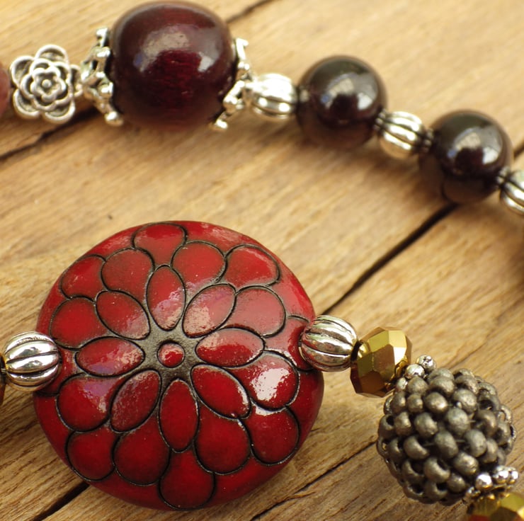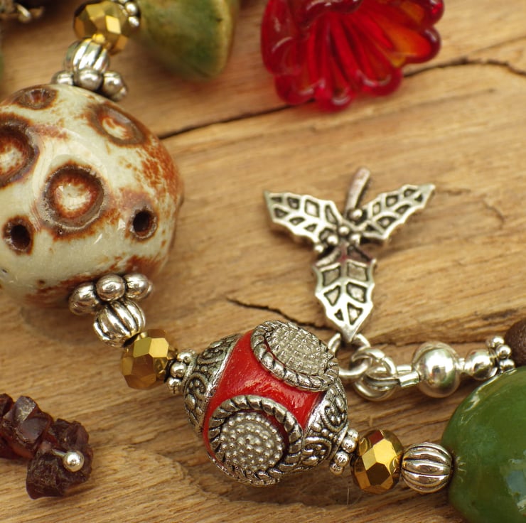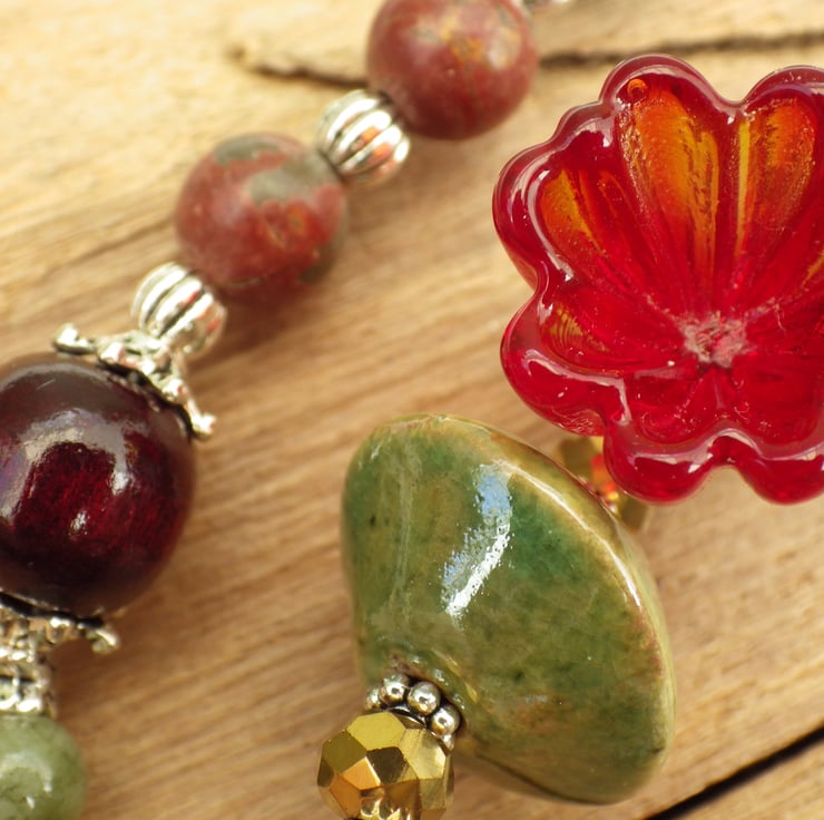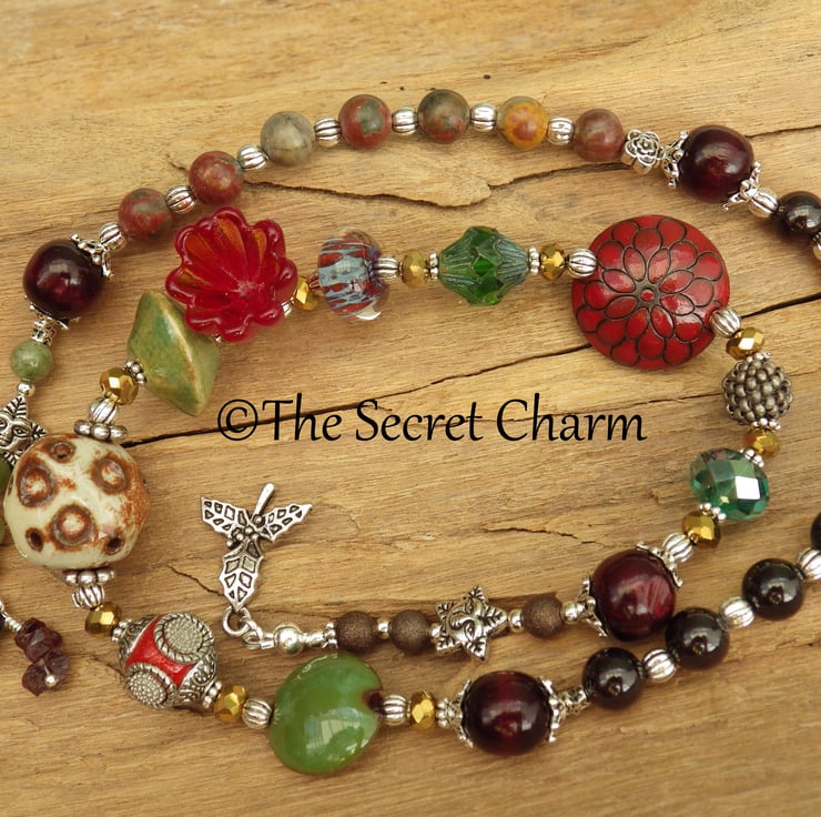 These pagan prayer beads are 24.5" (61cm) long and have been handmade with garnet gemstones, picasso jasper gemstones, raw ruby chunks, green peridot, gold plated crystals, copper beads, art beads, wooden beads, artisan ceramics and artisan lampwork glass.