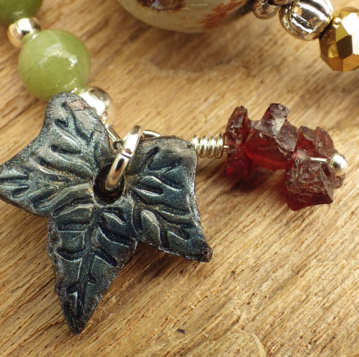 Ogham Ivy and holly have been chosen for protection. A hand-painted polymer clay ivy leaf (20x18mm) adorns one end of the prayer beads whilst a pewter holly leaf adorns the other.
