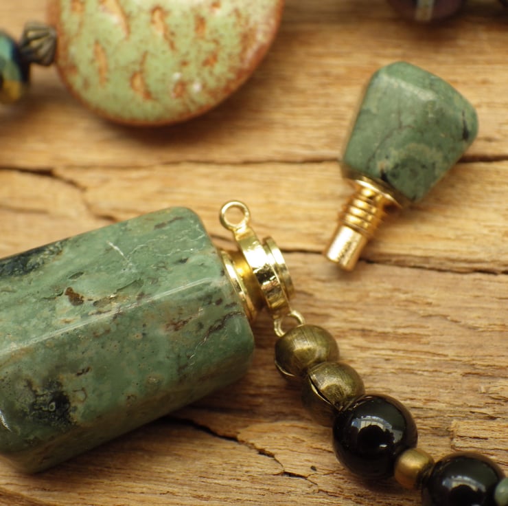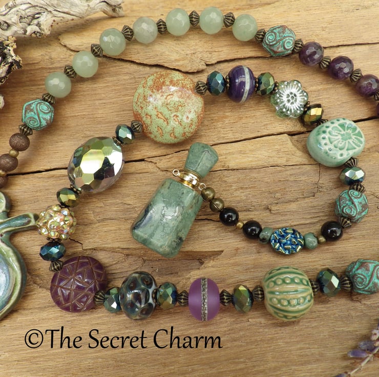 Gemstones include emerald, green aventurine, titanium plated hematite, amethyst, obsidian and a kambaba jasper miniature bottle. The bottle has a screw lid so that spell potions, perfumes or incense can be added by the owner.