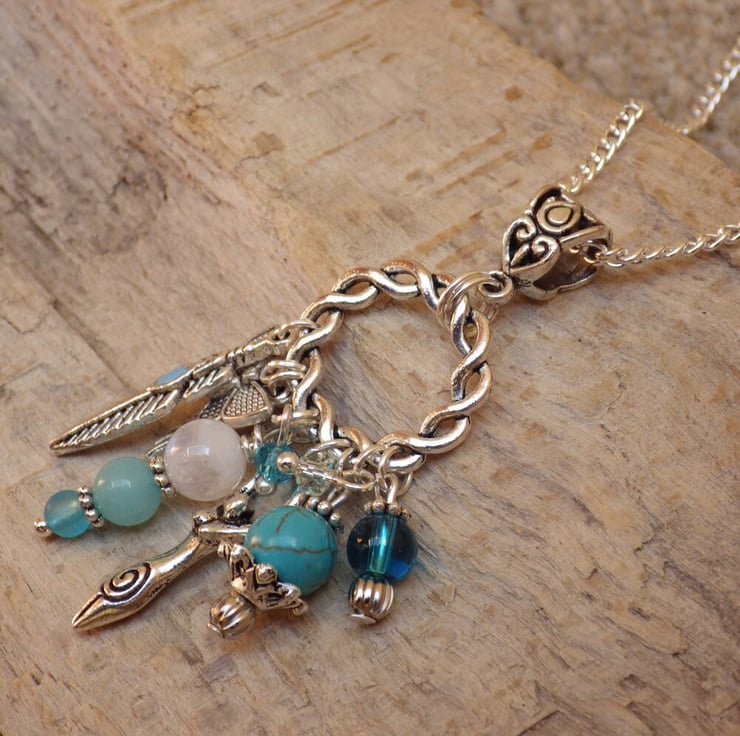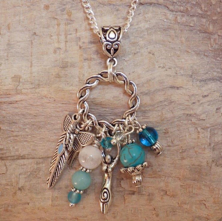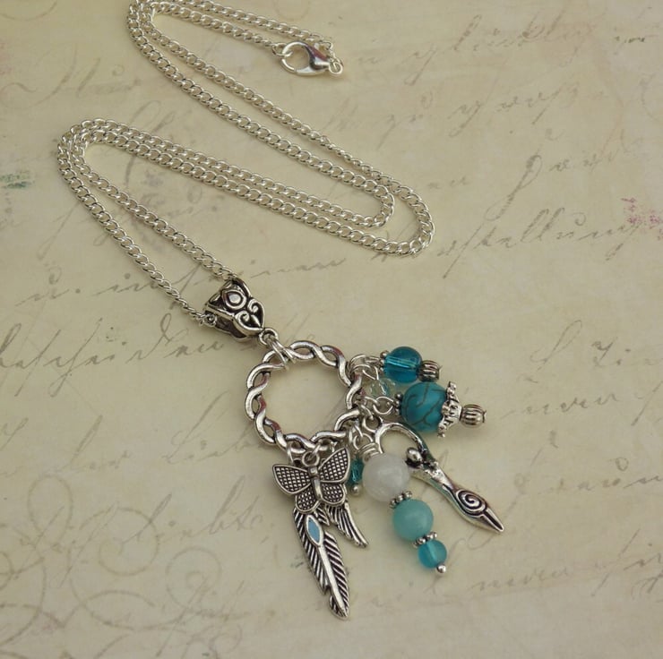 The cluster pendant holds iridescent rainbow moonstone, amazonite and howlite turquoise gemstones, interspersed with Swarovski crystal, Czech crystal and silver plated butterfly, feather, wing and goddess charms.