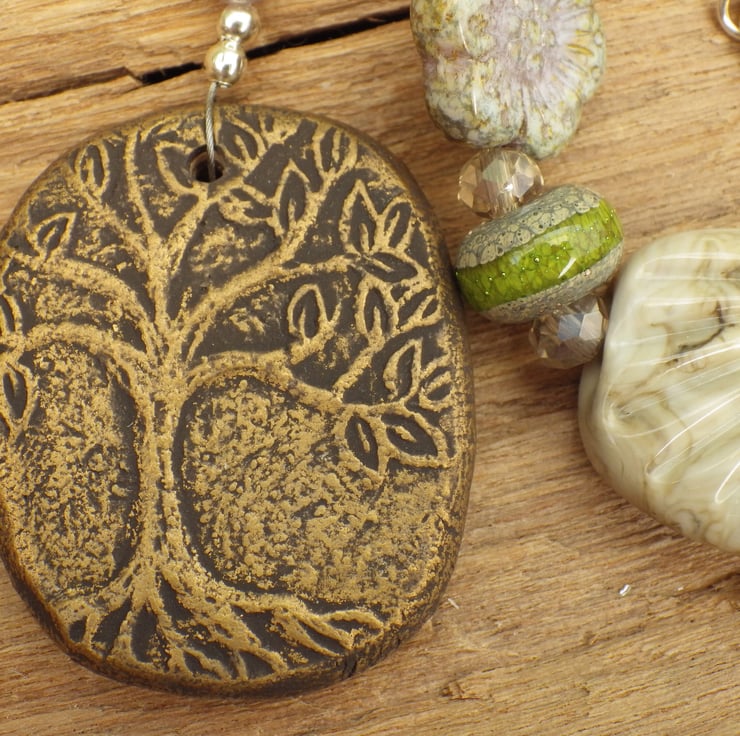 An artisan ceramic tree of life (41x33mm) hangs from one end of the beads, with a brass feather and sterling silver dangle (45x11mm) hanging from the other.