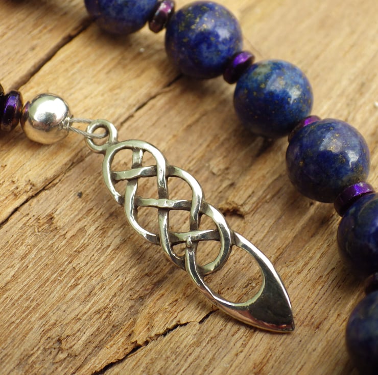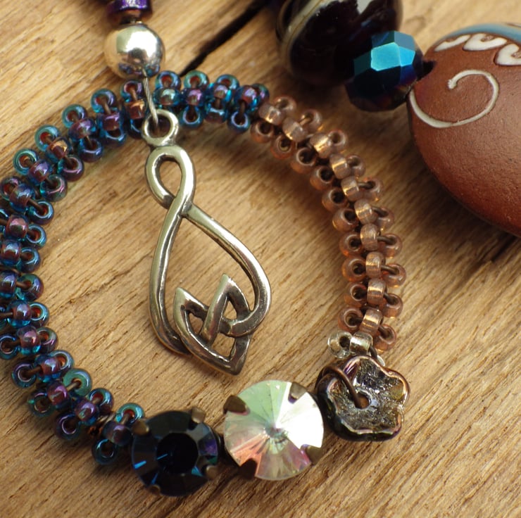 A 925 sterling silver Celtic Goddess (28mmx6mm) hangs from one end of the beads, with an artisan rhinestone beaded ring (35mmx34mm) with sterling silver Celtic knot hanging from the other.