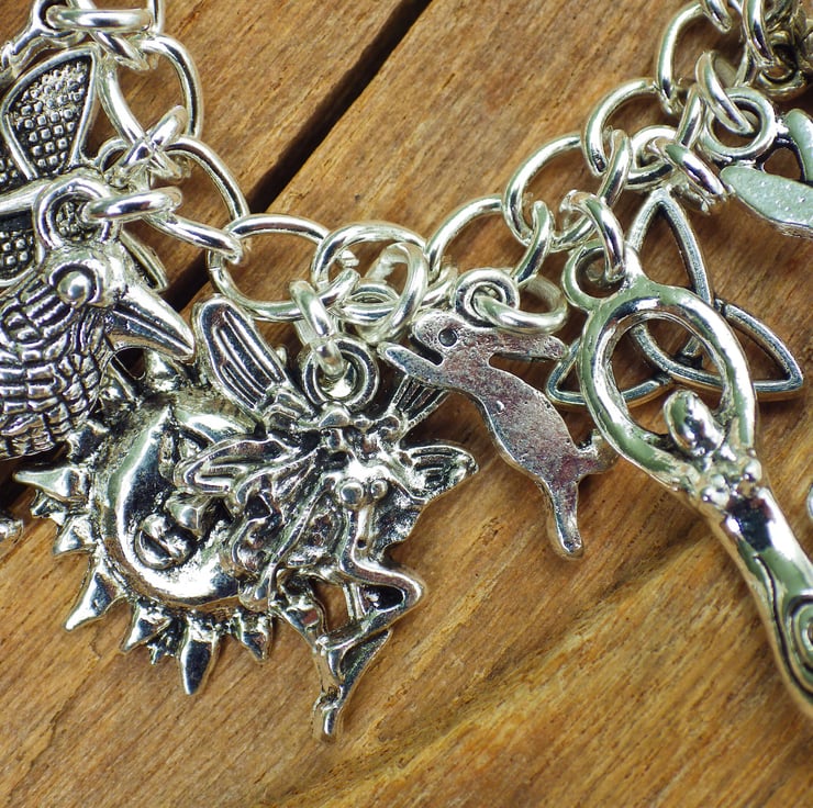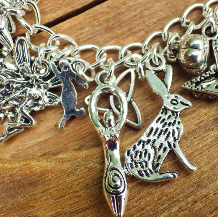 dragonfly, spiral of life, swallow, book of shadows, athame, witch's hat, circular tree of life, acorn, feather charm, bee, raven, fairy, sun, leaping hare, goddess, triquetra, sitting hare, toadstool, double star, flying witch, frog, apple, green man, butterfly, chalice, pumpkin, little star, crescent moon, leaf, deer, dragon, tree of life, angel wing, wolf, flower and pentagram.