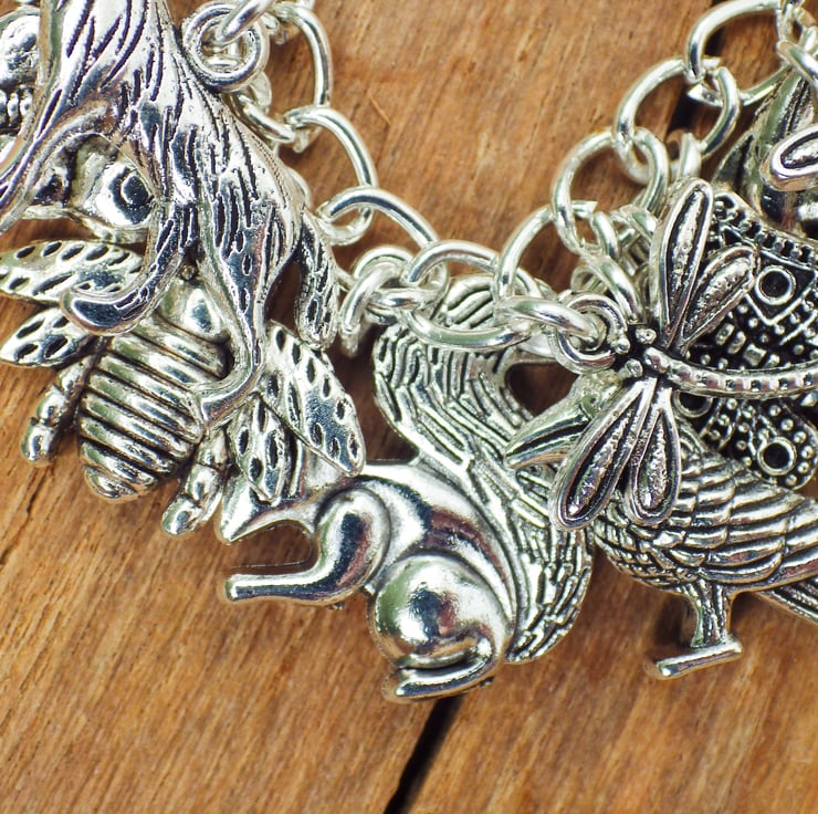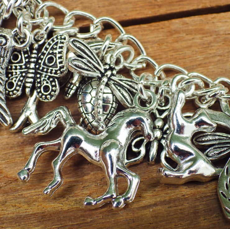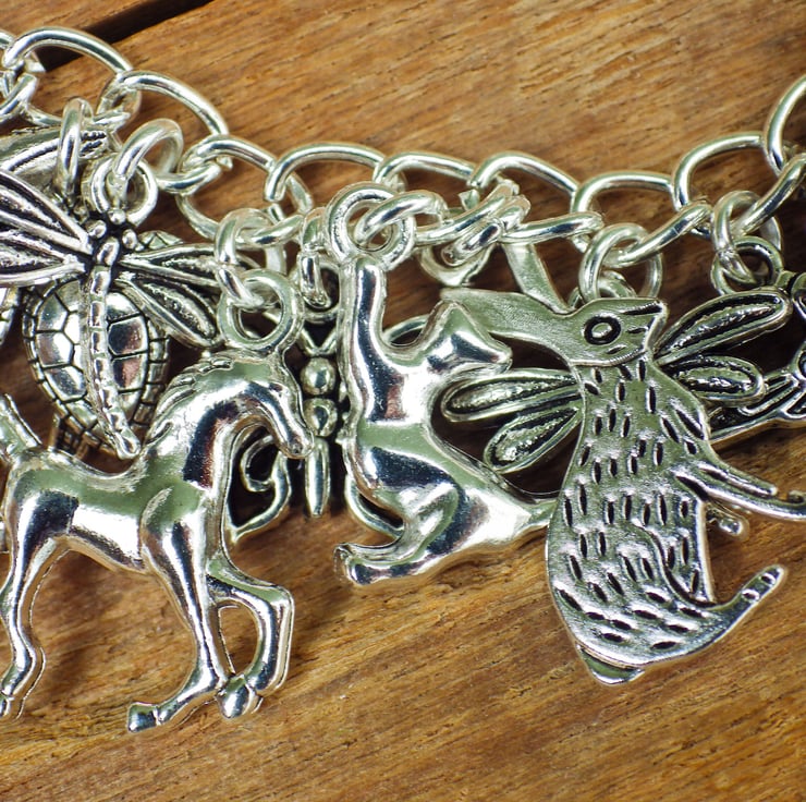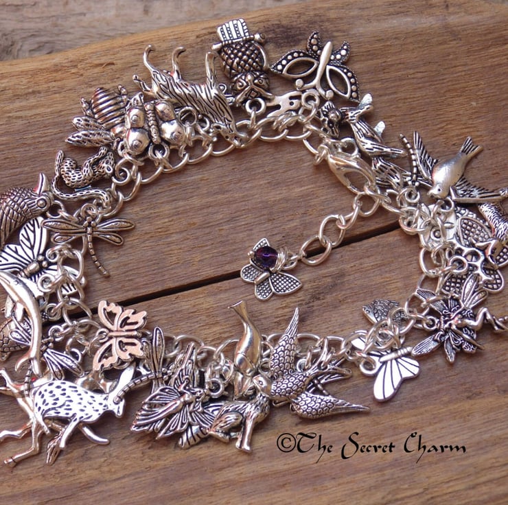This handmade bracelet has been loaded with 36 animal spirit charms, with a little wire-wrapped amethyst Czech glass crystal hanging from the extender chain.