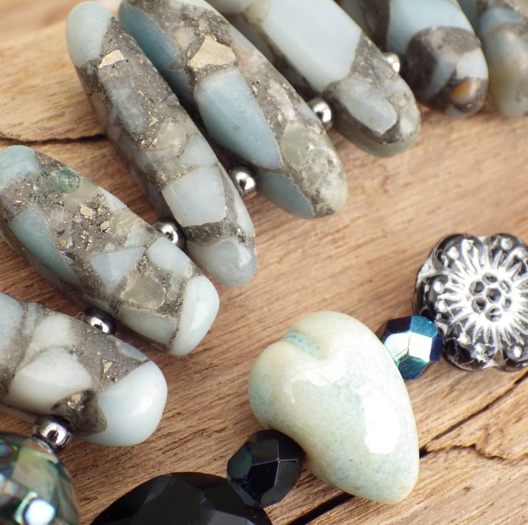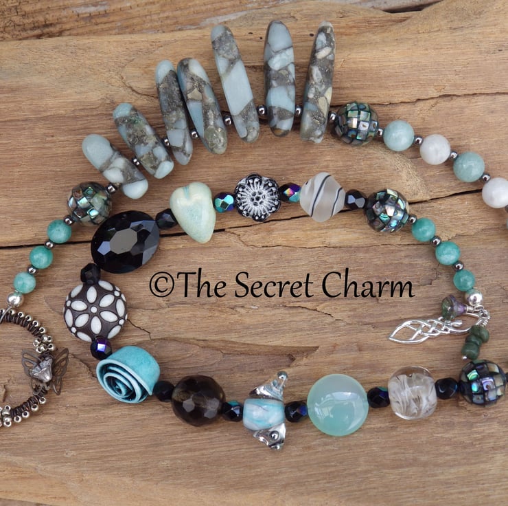 The strong feminine energies of this piece are amplified by the inclusion of handmade lampwork glass, ceramics and a beaded ring by female artisans from the UK, Germany and the US. There are some truly beautiful pieces of work included in this strand.