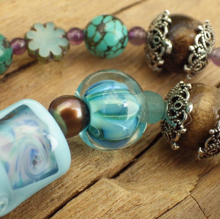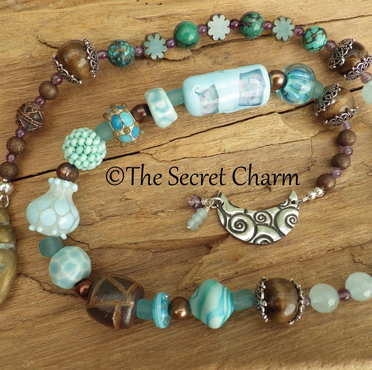 These beautiful sterling silver pagan prayer beads are 23" (58cm) long and have been handmade using high quality gemstones, sterling silver, artisan lampwork glass, artisan ceramics, copper beads, wood and freshwater pearls.
