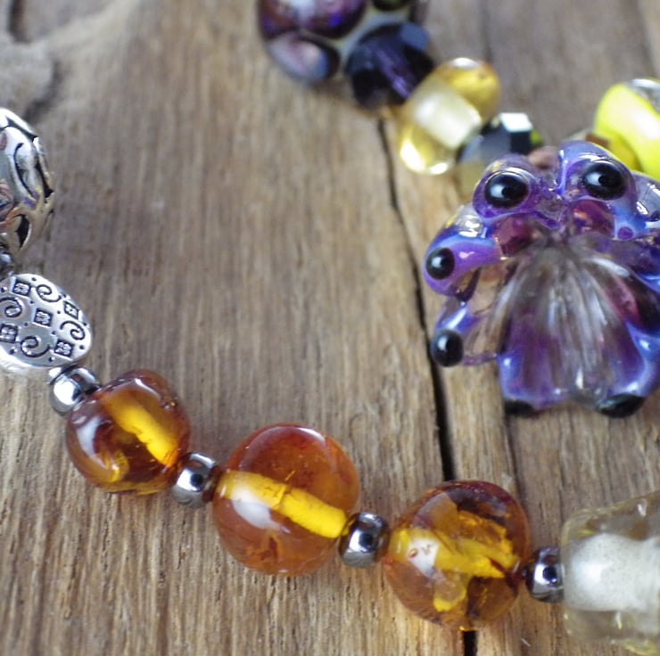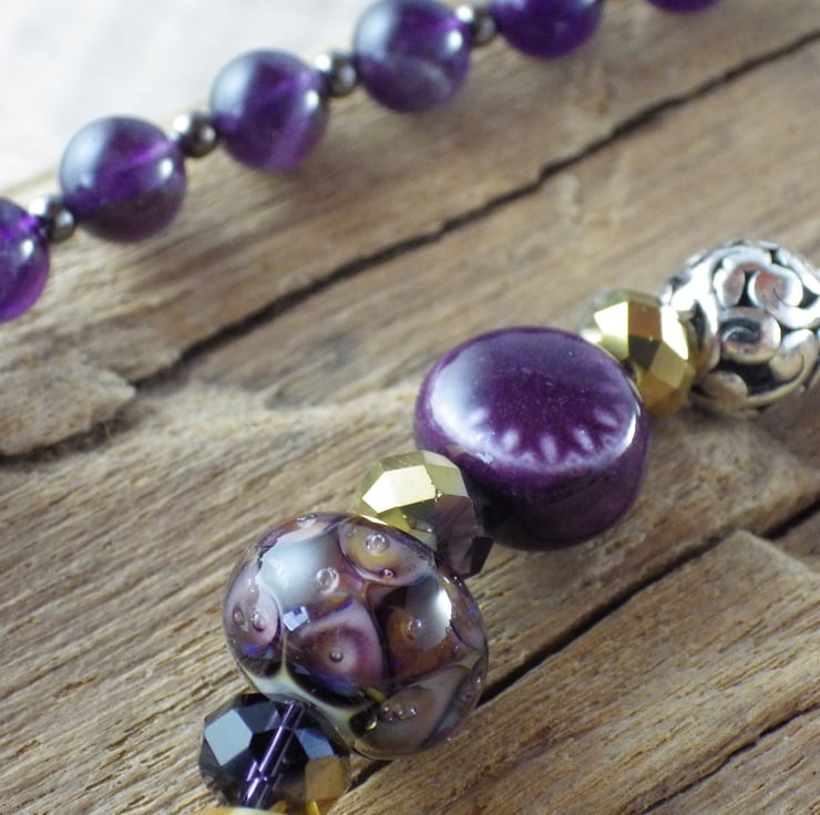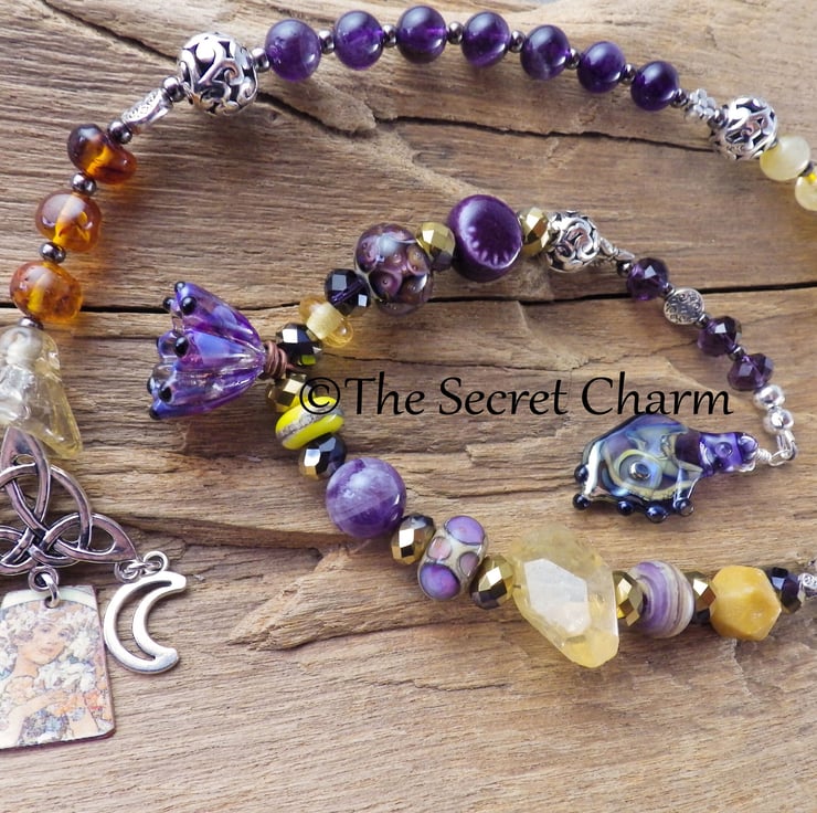 These special prayer beads are 22.5" (56cm) long and have been handmade with amethyst gemstones, citrine gemstones, yellow jade, amethyst crystals, artisan lampwork glass, artisan ceramic beads and silver filigree.