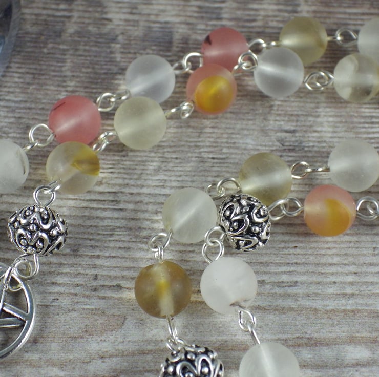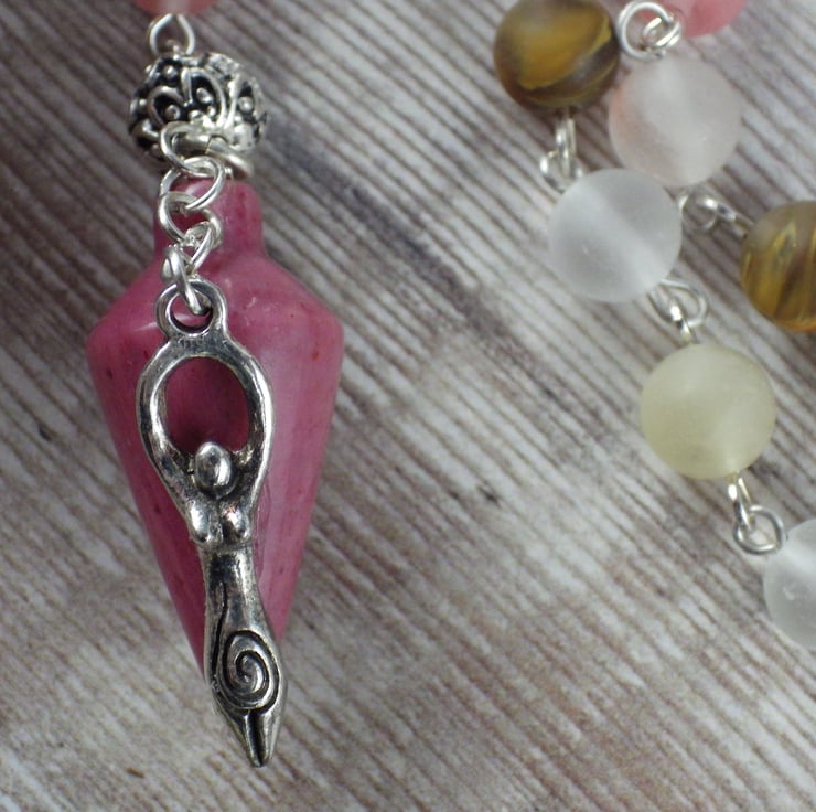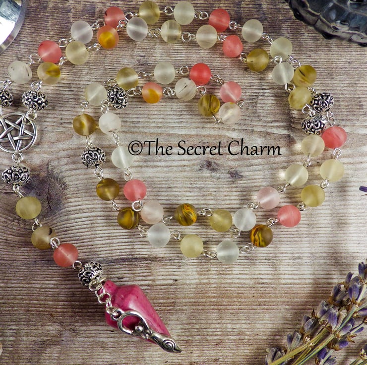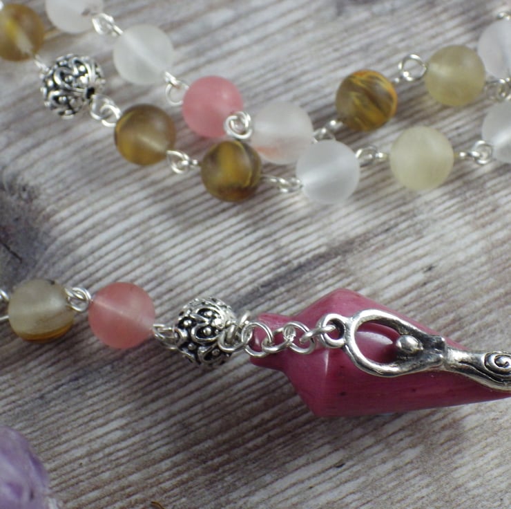 This Goddess Brigid gemstone rosary necklace has been handmade using 8mm frosted watermelon tourmaline gemstones, a silver pentagram, silver filigree beads and a rhodonite Goddess pendant.