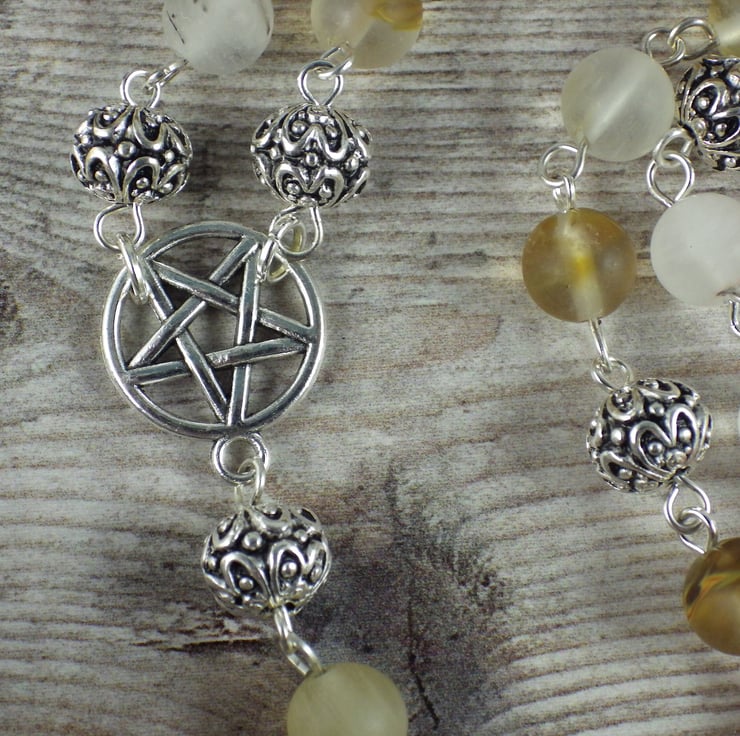 This necklace measures 31" (78cm) around, with an additional drop of 5" (12.5cm) from the top of the pentagram to the bottom of the rhodonite Goddess pendant.