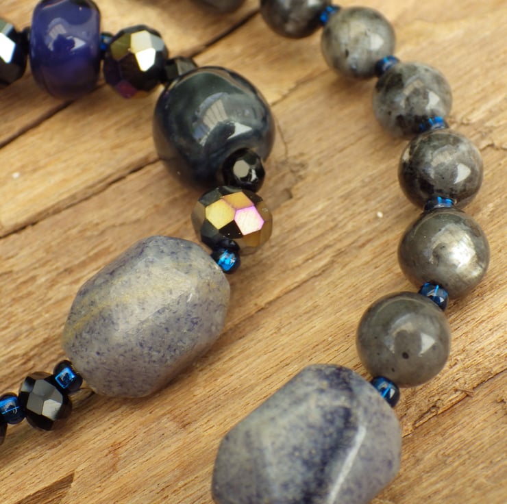 High quality gemstones include: lapis lazuli, labradorite, obsidian, blue chalcedony, dragons vein agate and blue aventurine.