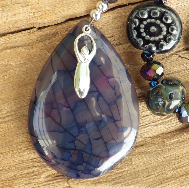 An artisan lampwork glass wing (32x21mm) hangs from one end of the beads, with a sterling silver Goddess Lilith on a dragons vein agate pendant (52x36mm) hanging from the other.