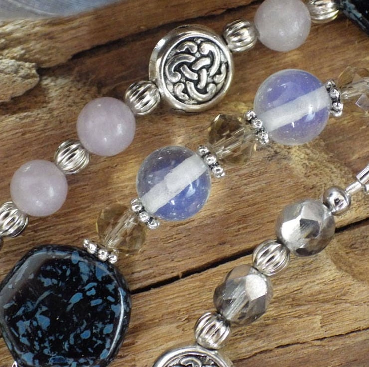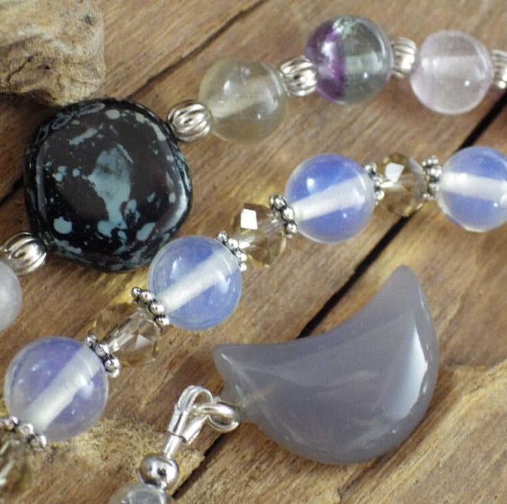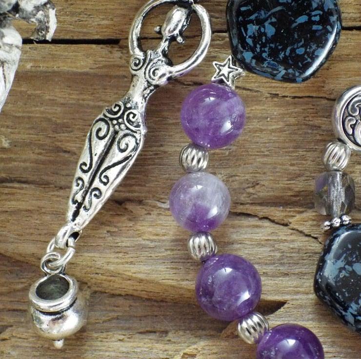 They are 23" (58cm) long and have been handmade with amethyst, fluorite, lilac quartz and opalite gemstones divided by Picasso Czech glass. I've complimented these with topaz czech crystals, celtic knot symbols, a 3D cauldron charm, a lilac agate crescent moon and Goddess Cerridwen herself.