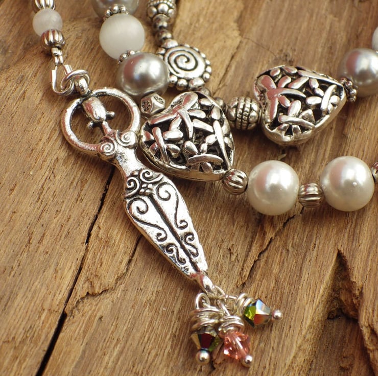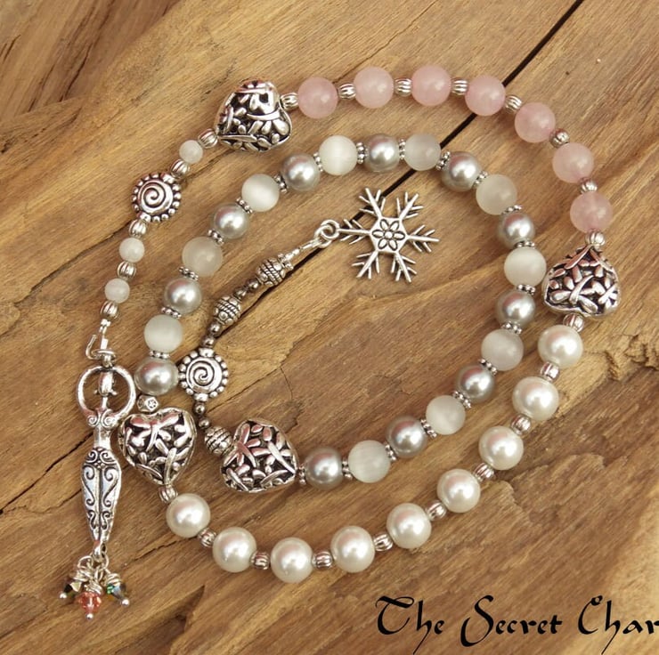 The strand includes the Goddess Nicneven (34mm) with Swarovski crystals, Celtic spirals of life and a winter snowflake (20mm).