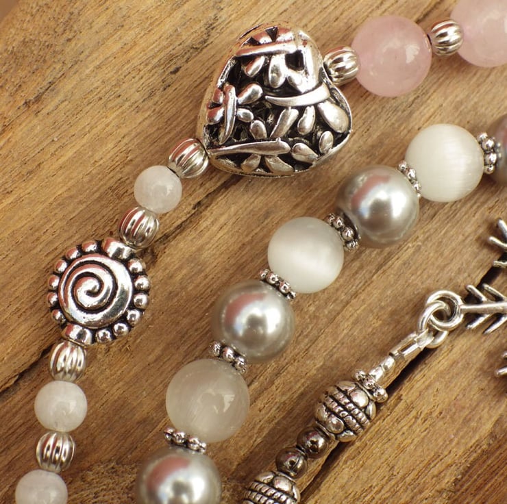 I've chosen rose quartz as a stone of unconditional love and infinite peace, and cat's eye as a grounding stone and to bring confidence, happiness, serenity and good luck.