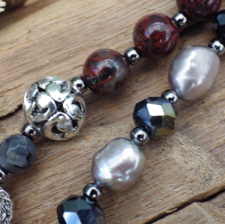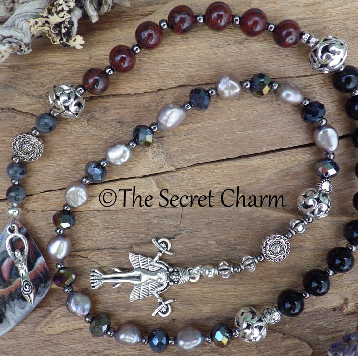 Handmade with black obsidian, labradorite, lilac freshwater pearls, jet black crystals, fiery poppy jasper gemstones, silver hearts and flowers, filigree orbs and an artisan wing with Goddess Lilith in mind.