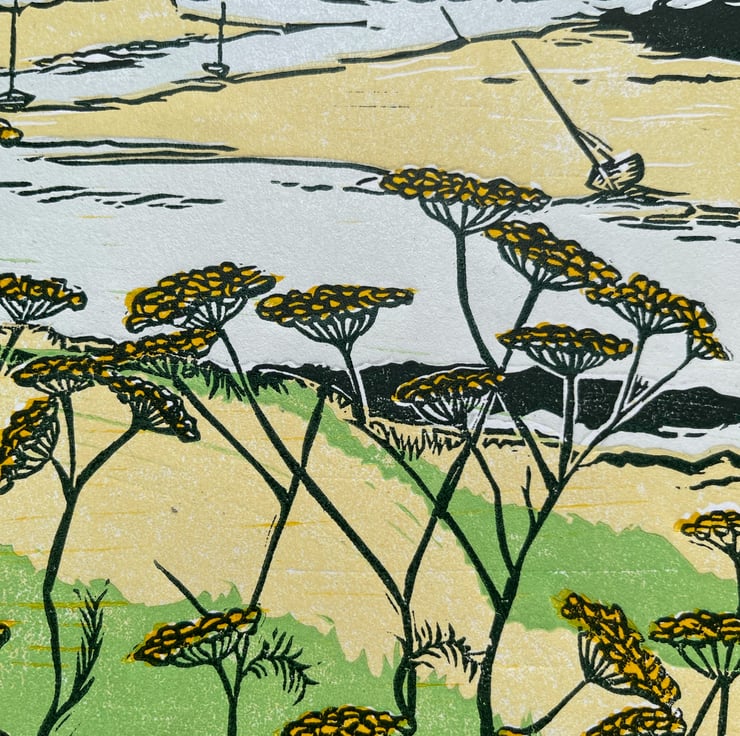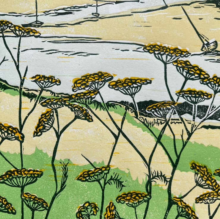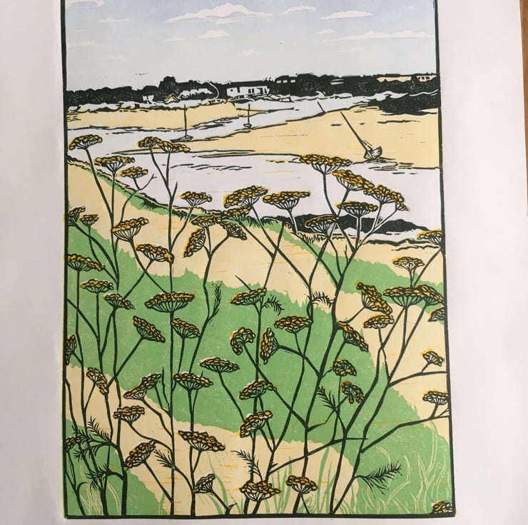 This print is a view from the bank at Burnham Overy Staithe, North Norfolk, looking back at the harbour through the wild fennel.