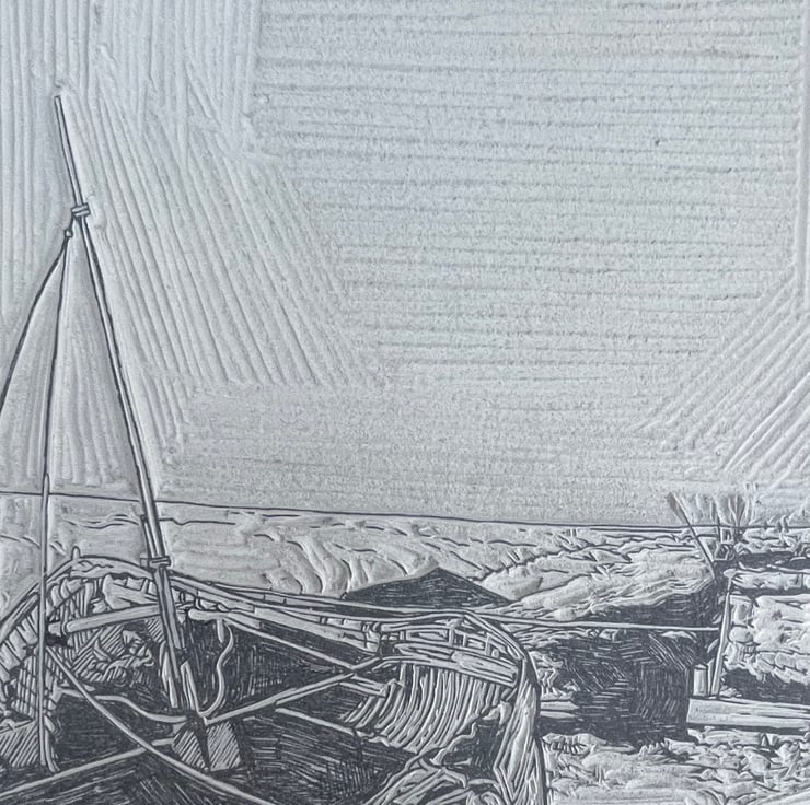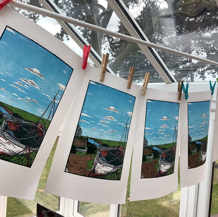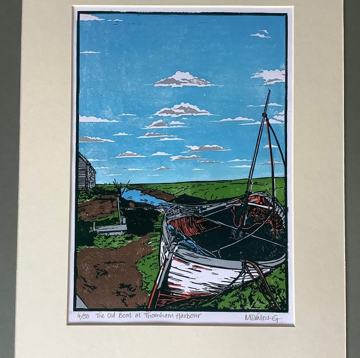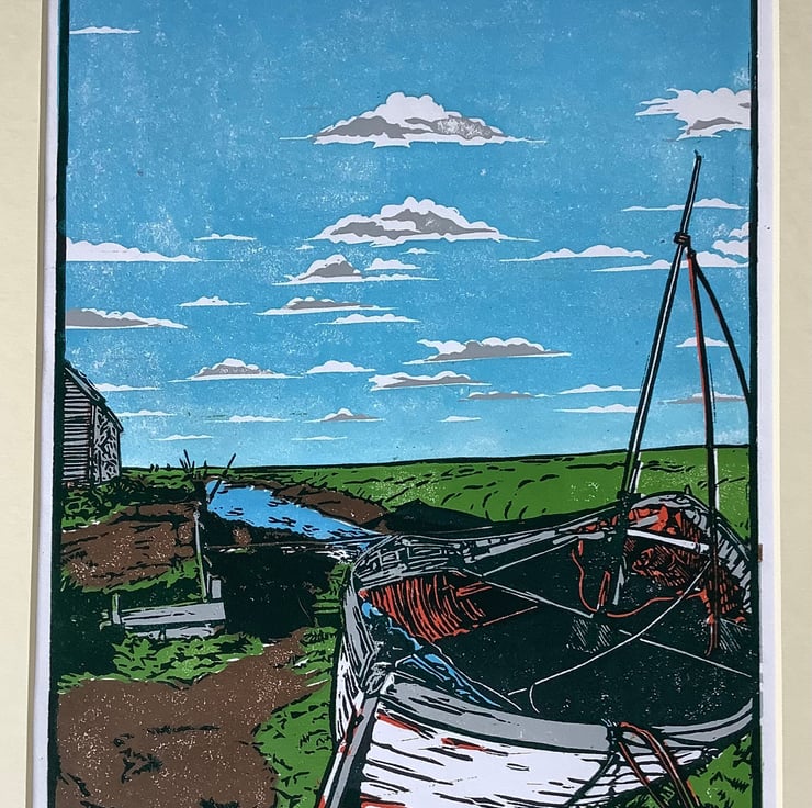 One of my original hand printed linocuts of the old boat at Thornham harbour in North Norfolk.