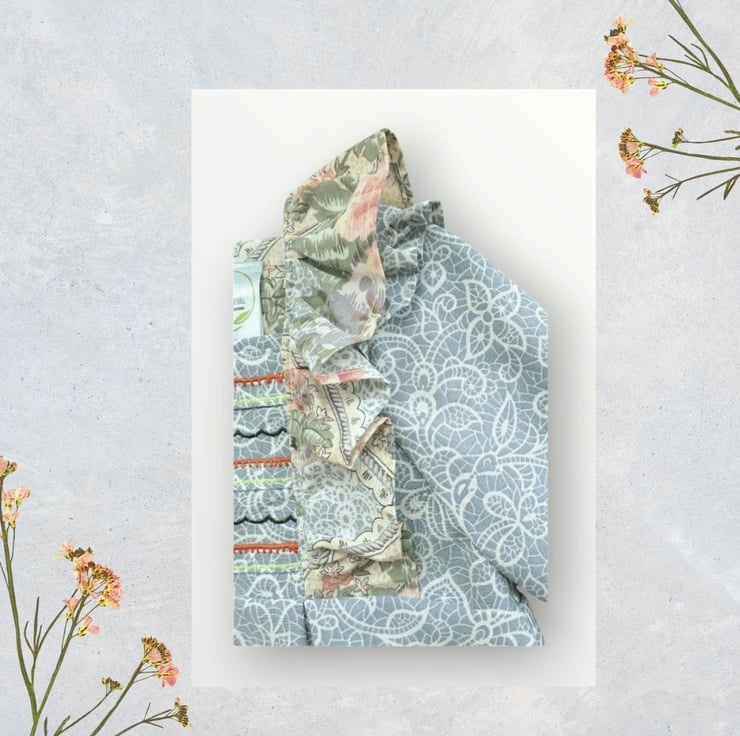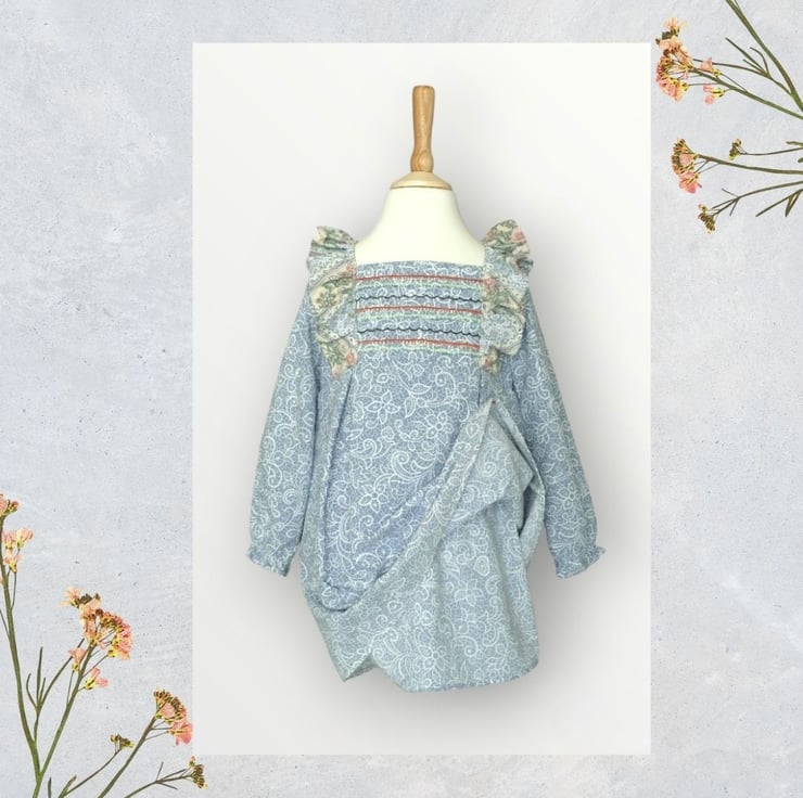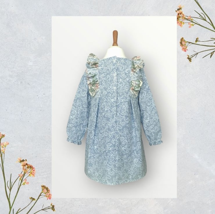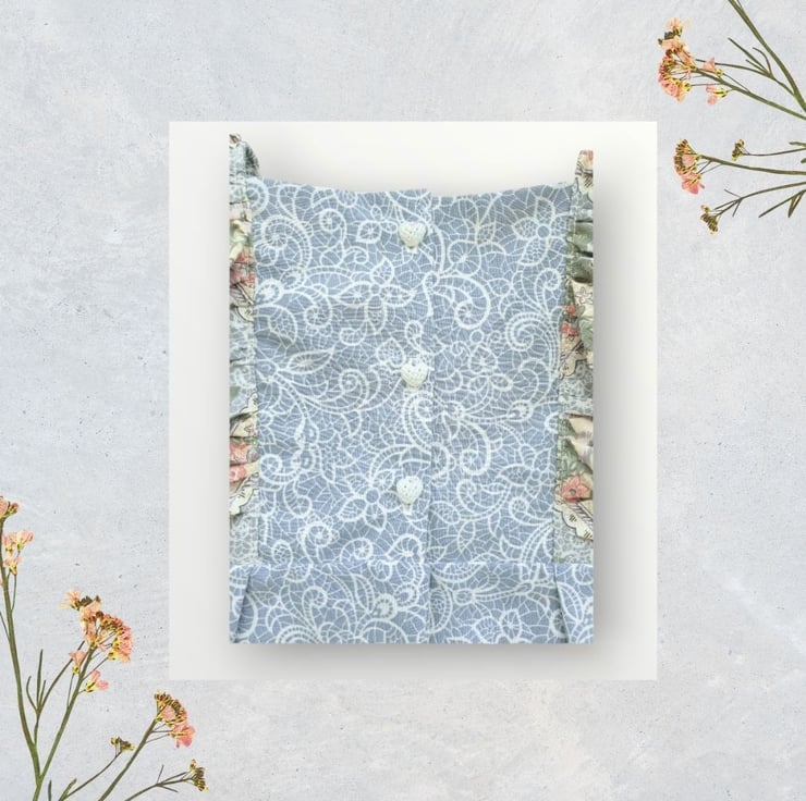 This empire line dress is in a blue and ivory printed paisley design, with a matching rose print on the frills. I have embroidered lines across the front in quirk colours to give her the overall look a bit more colour and character. She has puff sleeves with elasticated cuffs and inverted pleats in the front and back. And little pearl effect heart shape buttons at the back. She also comes with a matching scrunchie in a free organza bag.