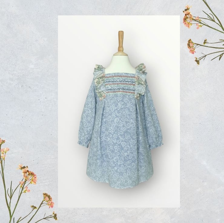 As this is quite a traditional looking fabric I thought I would jolly it up with some quirky embroidery on the front bodice. It highlights the empire line and brings a bit of colour to the look. You could easily dress her up with some cream tights and posh shoes, or make her for a slightly less formal occasion, with leggings and trainers or pumps.