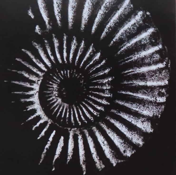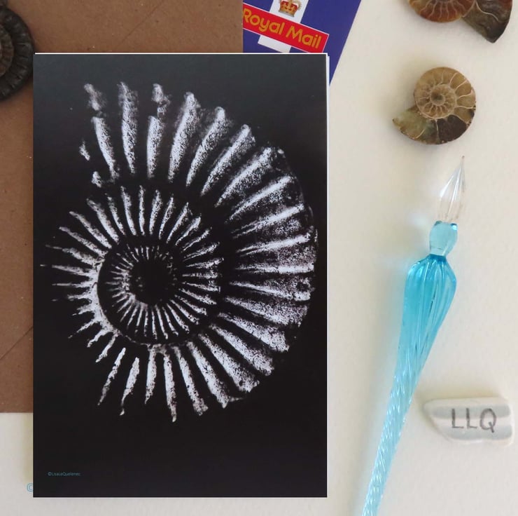 A blank greeting card of an ammonite spiral fossil reproduced from my original photograph that has been digitally manipulated.