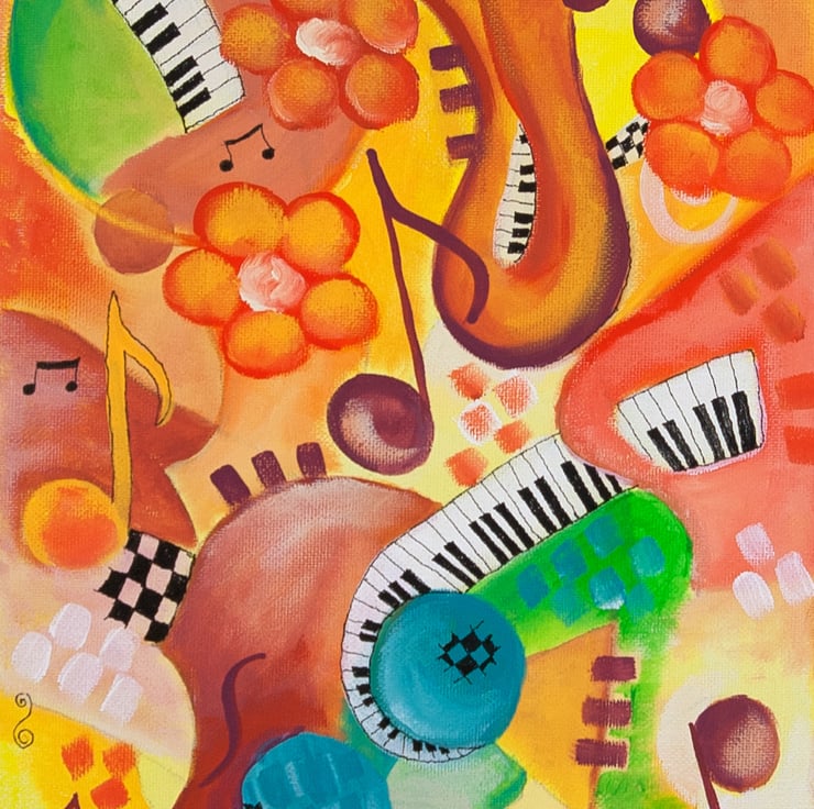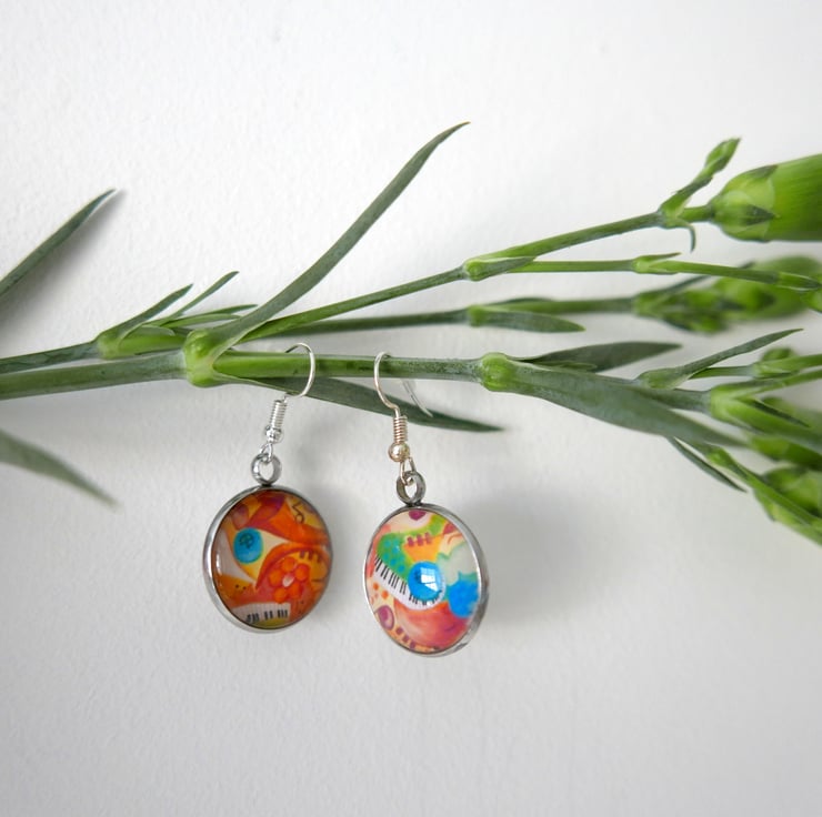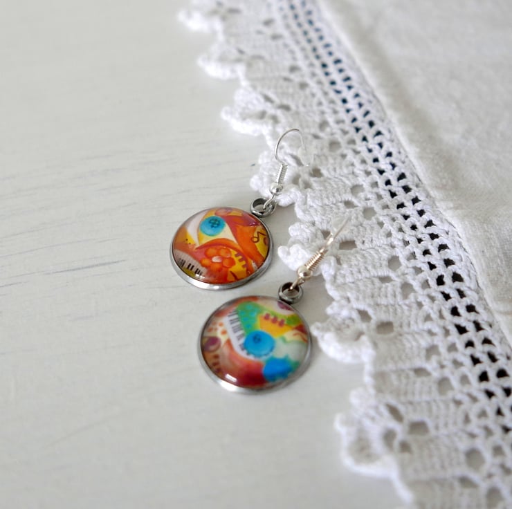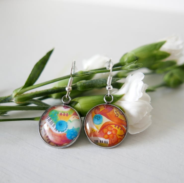 These dangle earrings with an abstract design are created using an art print after one of my original abstract and decorative paintings inspired by music. The earrings are not identical, they are mixed and matched showing different parts from the same painting. The last image shows you the painting.