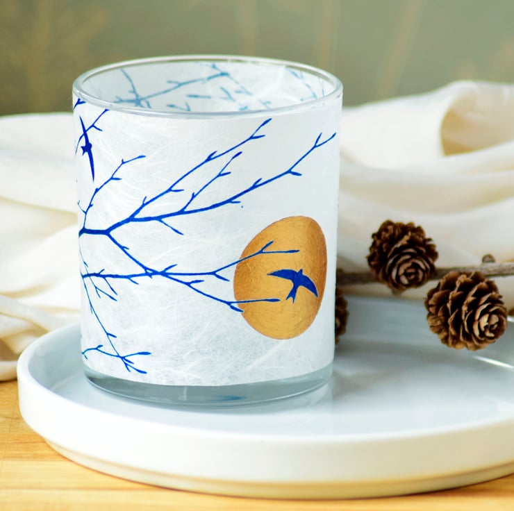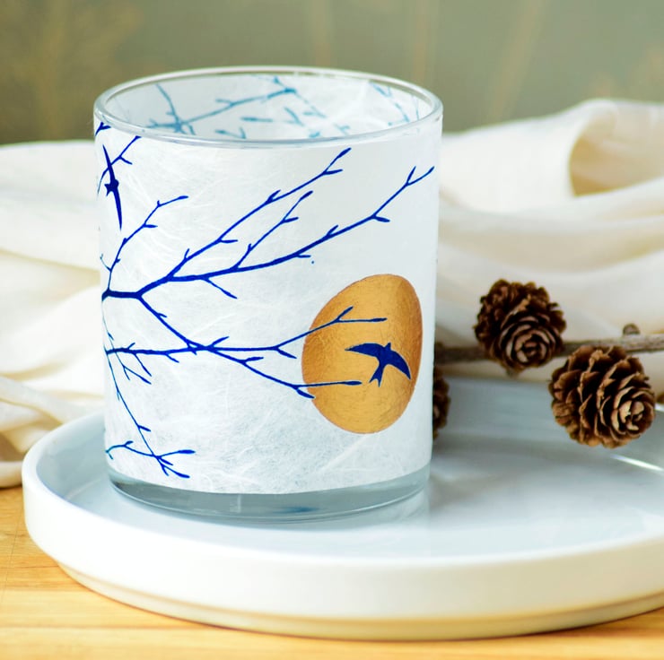 The distinctive silhouette of a Swallow resting on a branch is captured on this contemporary candle holder. The hand painted gold circle creates a luxurious feel to this candle holder, evoking the light of a setting sun behind the bird silhouette. When the candle is lit the light flickers through bringing the image to life!