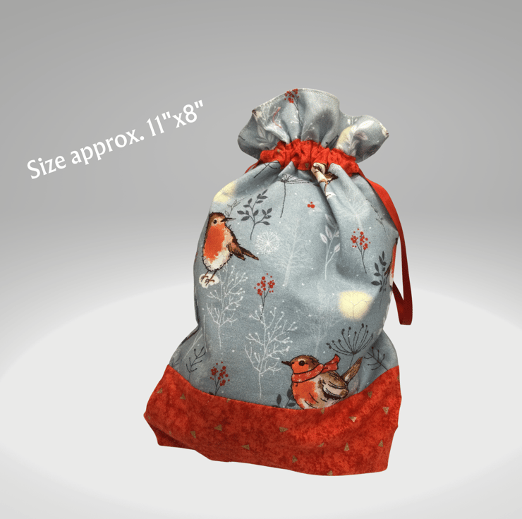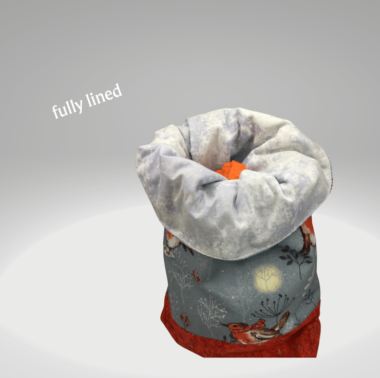 Cheery robin fabric has matching orange bottom, dotted with little gold hearts. These gift bags ae lined with cotton and can either be shared and used or kept for storing festive goodies. Good size will accommodate small book, bag of tea/coffee....and so on.