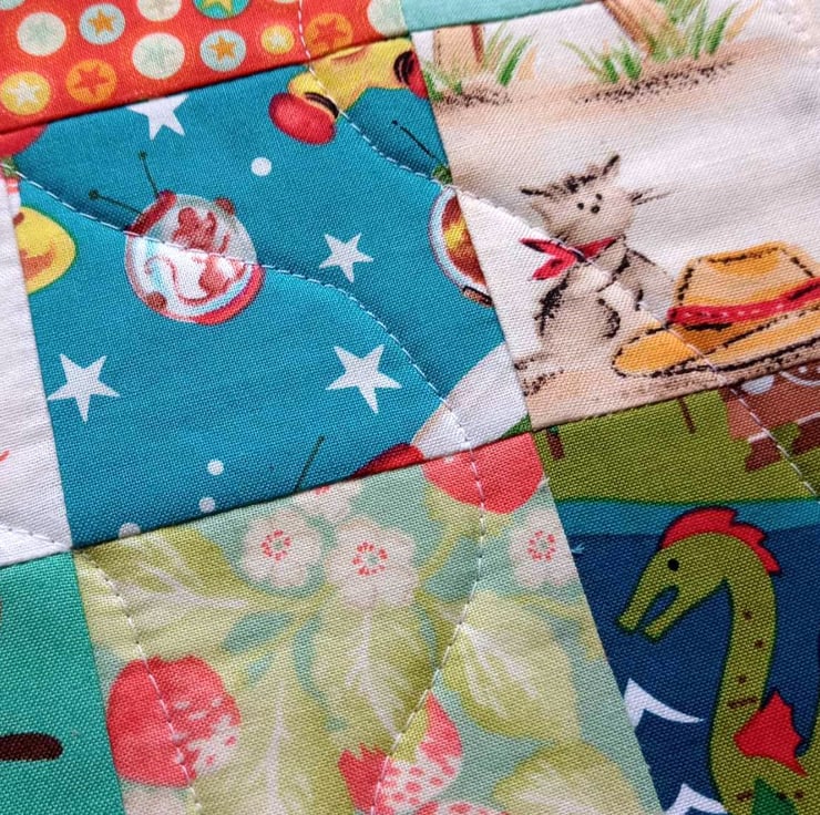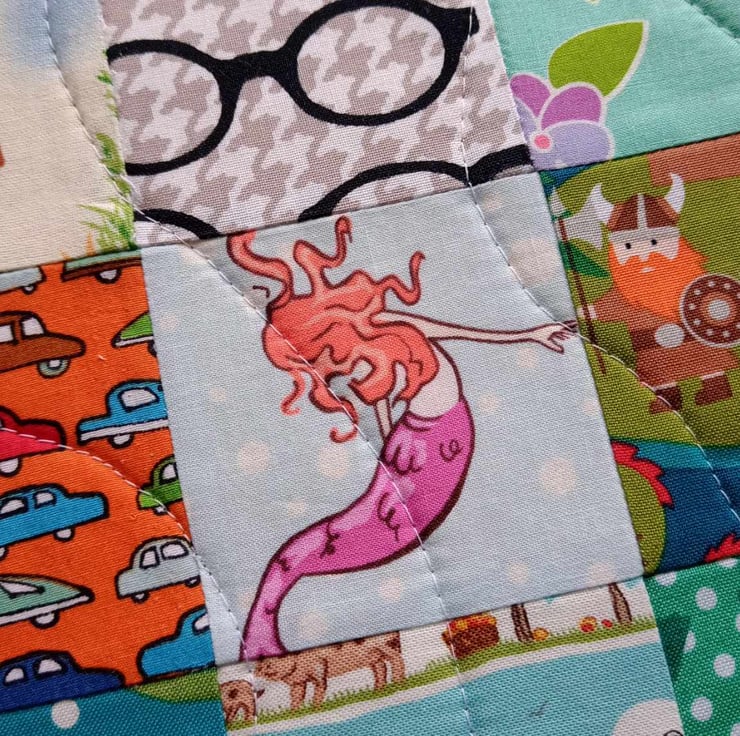 Materials: a patchwork of 100% cotton prints on each side interlined with a thin wadding and lightly quilted.