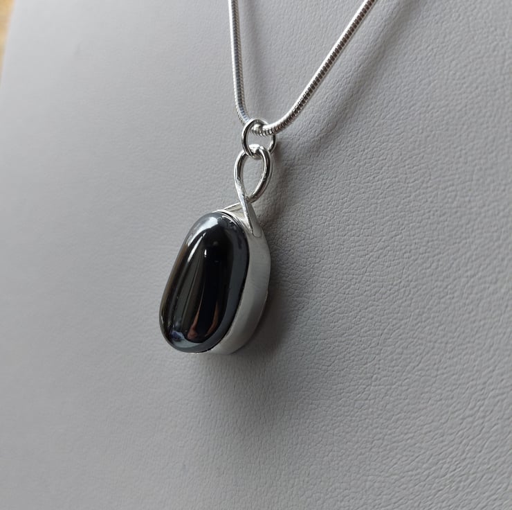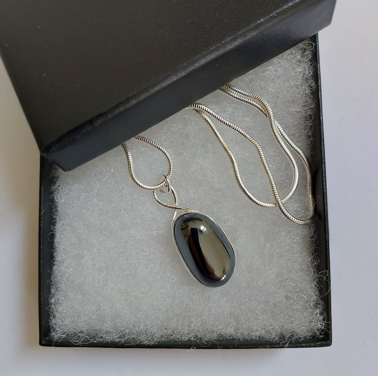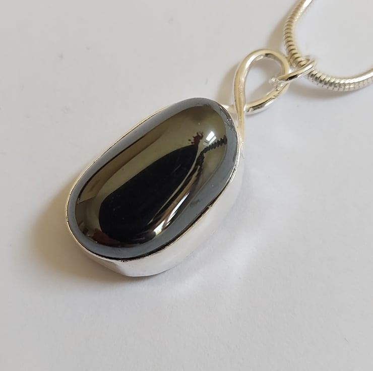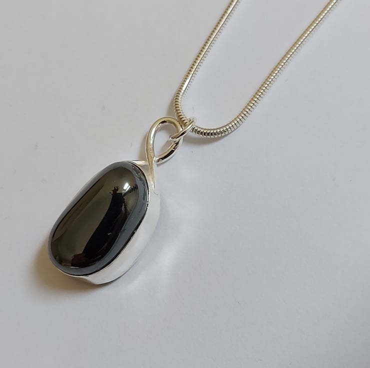 This freeform pendant is designed to display the beauty of a haematite gemstone. Haematite is a form of iron oxide, notable for its dark gunmetal colour and shiny surface. It enhances a smart outfit and stands out from other jewellery. This stone is enclosed within a handmade sterling silver bezel loop and has a bail and jump ring at the top for connection to the chain. A soldered-on strip of silver and some jeweller's glue have been used to hold the stone firmly in place. The pendant has been polished and hung from an 18inch/45cm sterling silver 1.6mm snake chain.