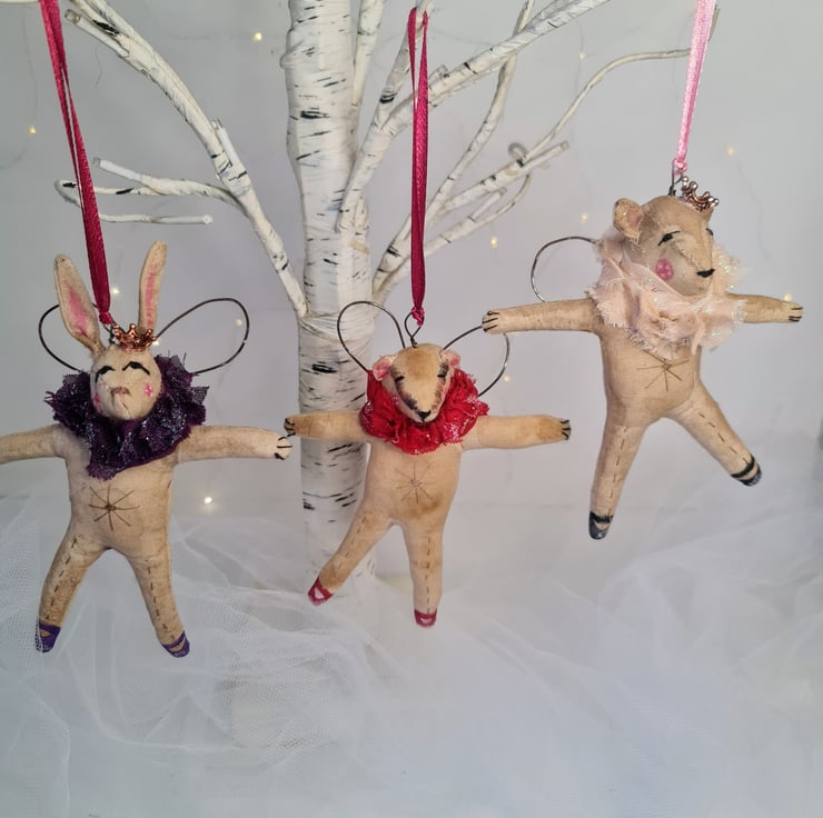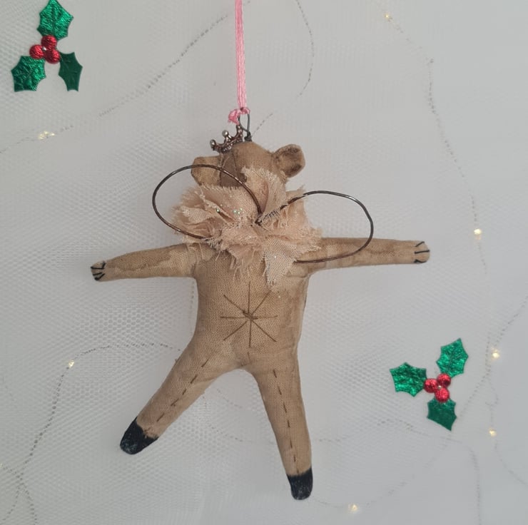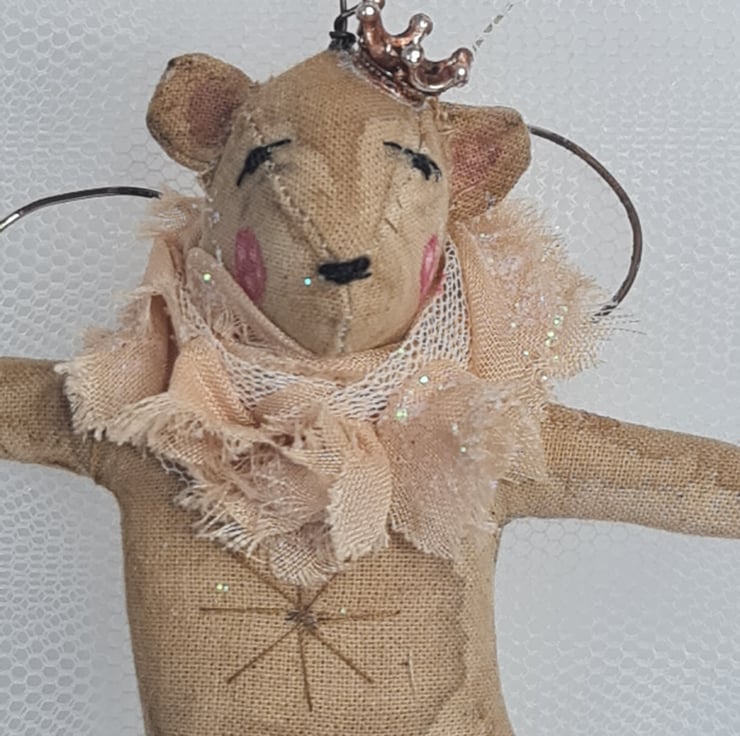 Hand and machine stitiched in unbleached cotton. Hand painted and stained. Bear has an antique pink ruffle and a little crown. His wings are fashioned in wire made to look rusty. Stars amd running stitch embellish his body. Topped with a sprinkling of sparkles.