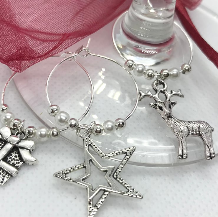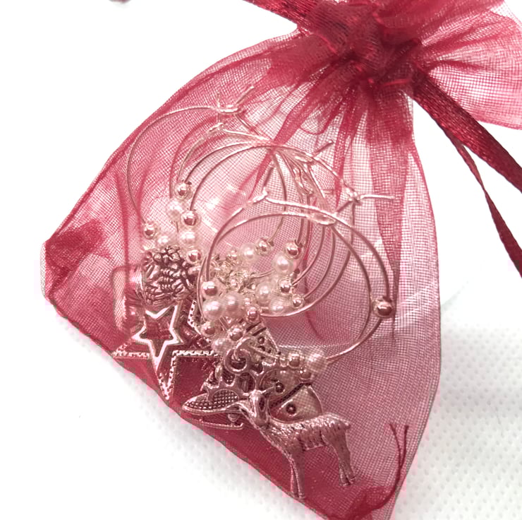 8 beautiful Wine Glass Charms each with a different Christmas Charm on and tiny ivory and silver coloured beads. They are provided in a pretty, sheer, burgundy organza drawstring bag and not only dress your wine glass and Christmas dinner table, but also make sure that glasses don’t get mixed up (guests enjoy taking theirs away as a keepsake too). They easily clip around the stem of your wine glass. These also make lovely stocking fillers, cracker fillers and advent calendar fillers. They are handmade, with care.