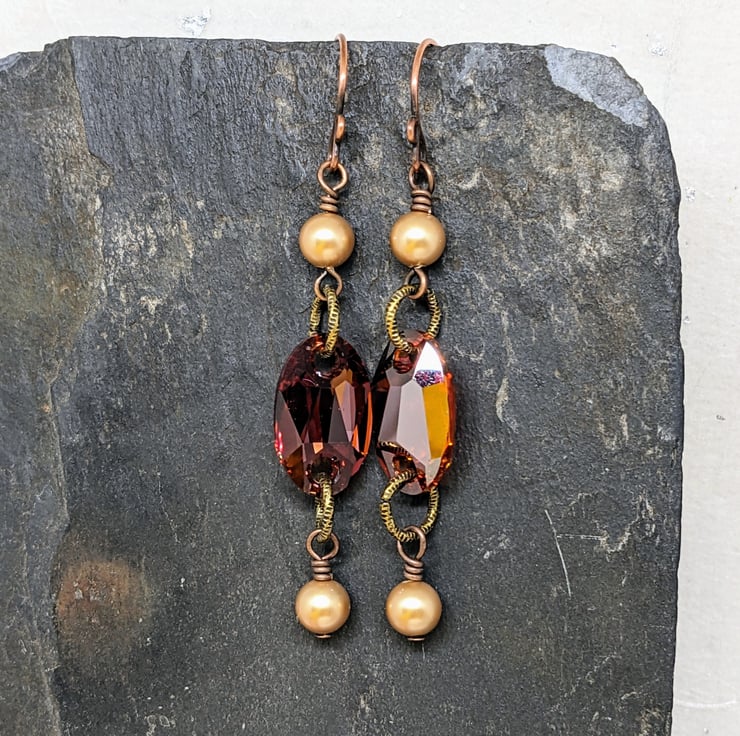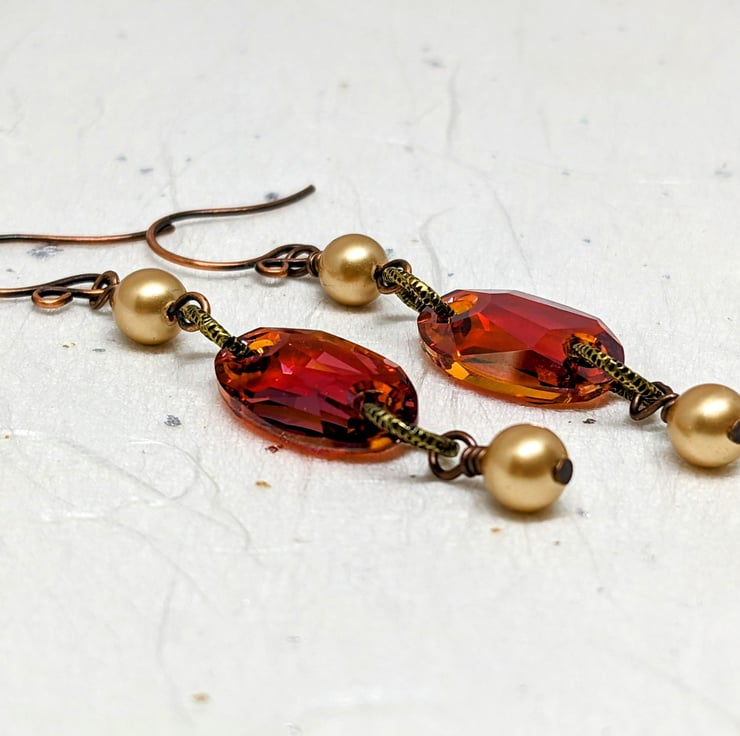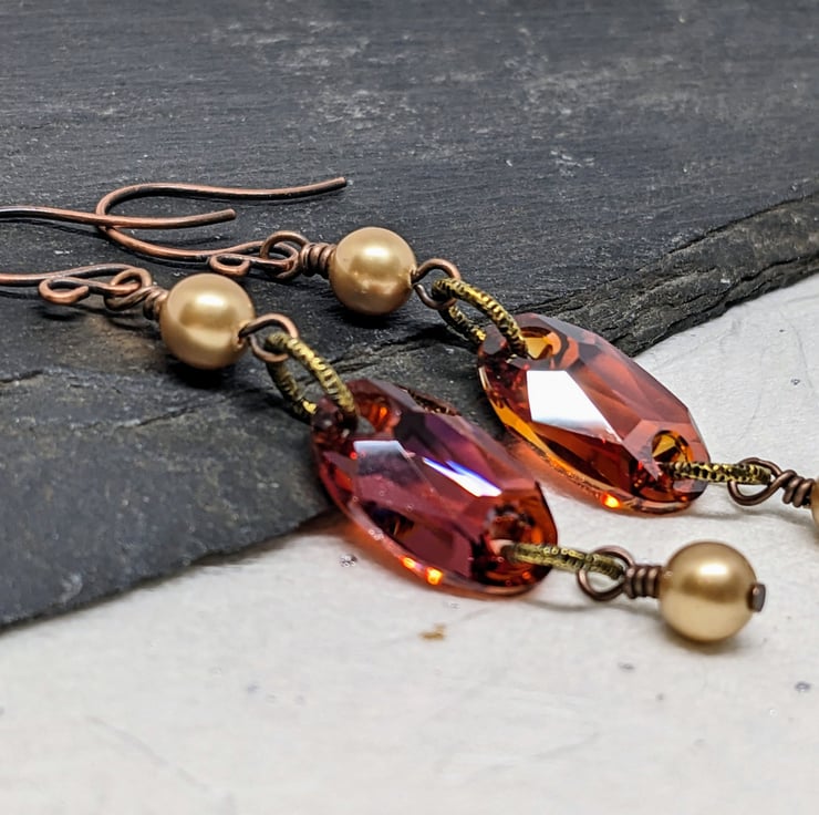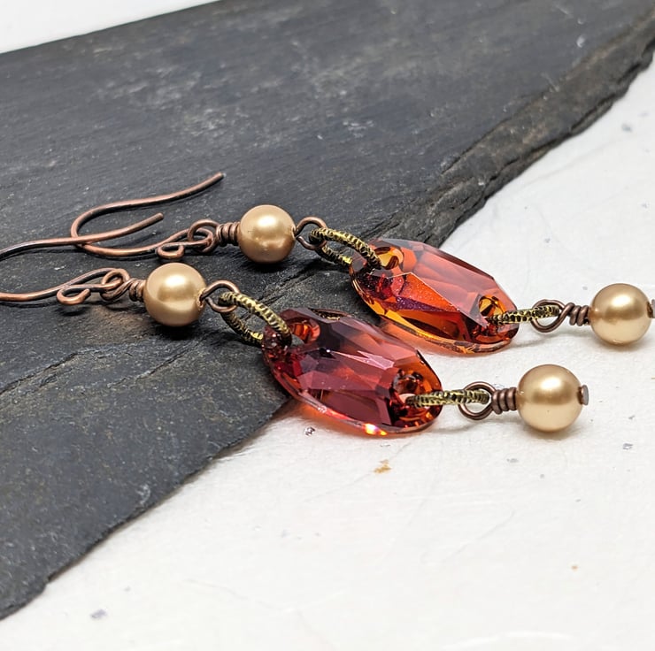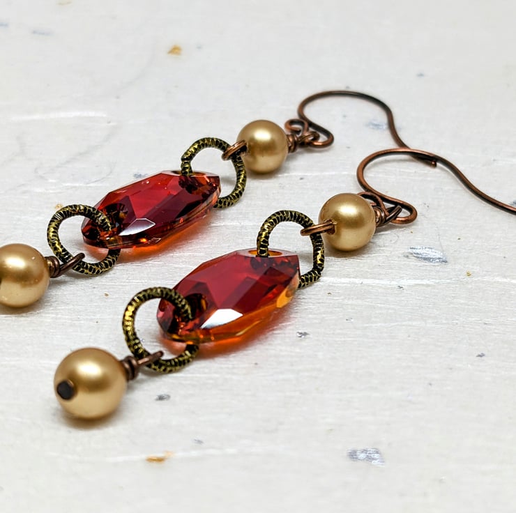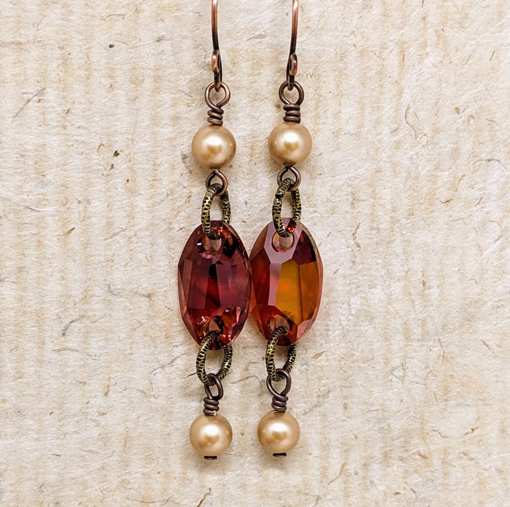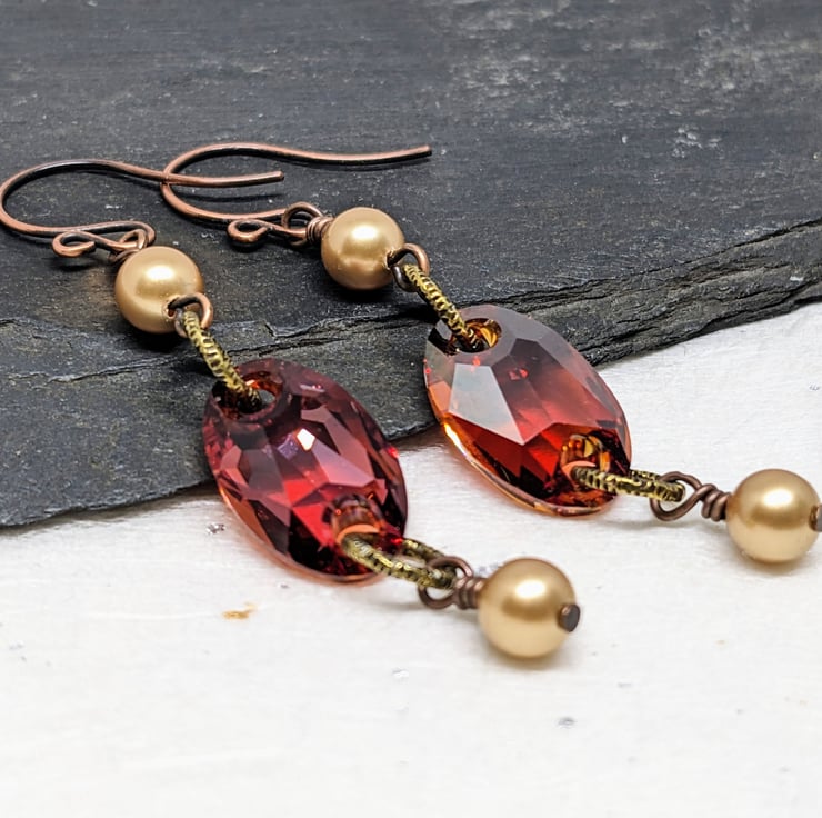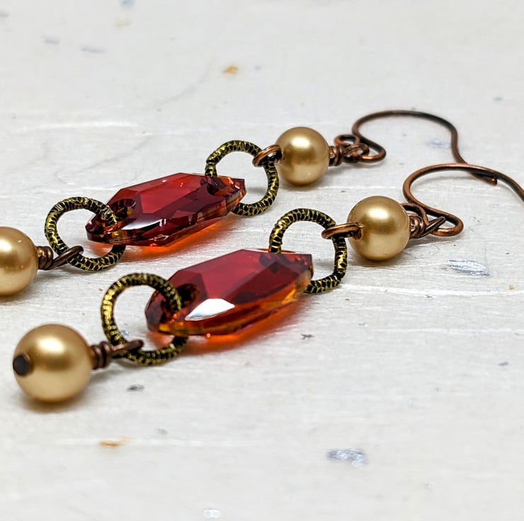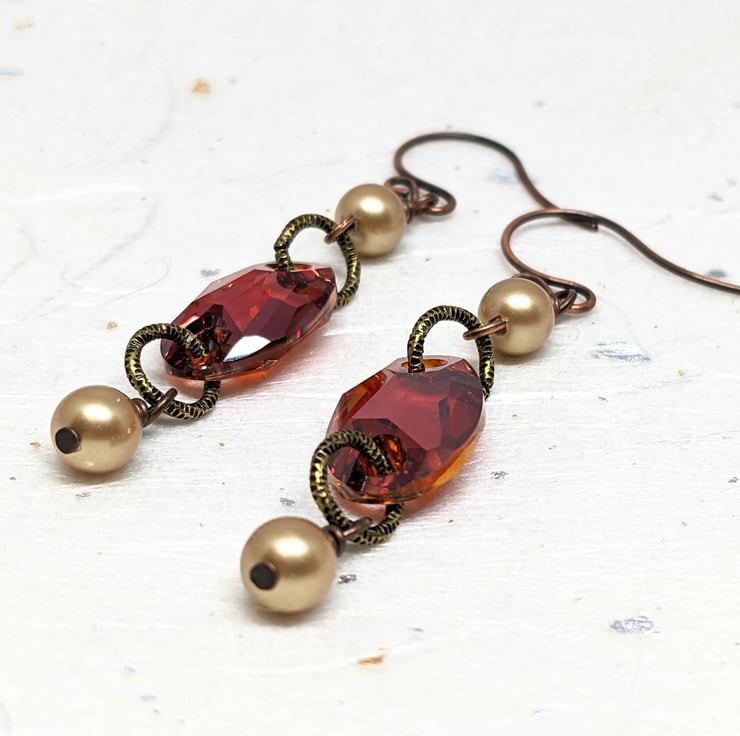 These glamorous earrings feature stunning Swarovski crystal buttons in a rusty coppery red colour. A faded gold Swarovski glass pearl hangs either side of them, with textured jump rings holding everything together. Handmade copper ear wires complete them.