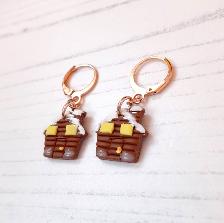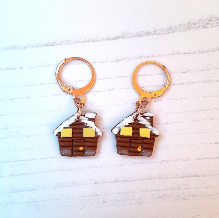 A pair of gorgeous log cabin house earrings, with carefully hand painted detail, and a snow covered roof They are perfect to accessorise that Christmas outfit!