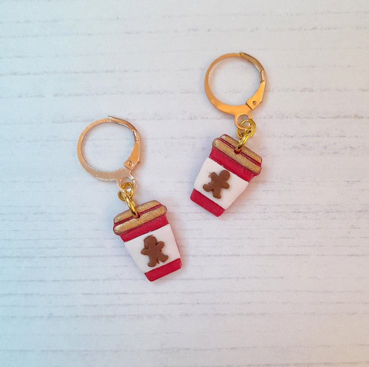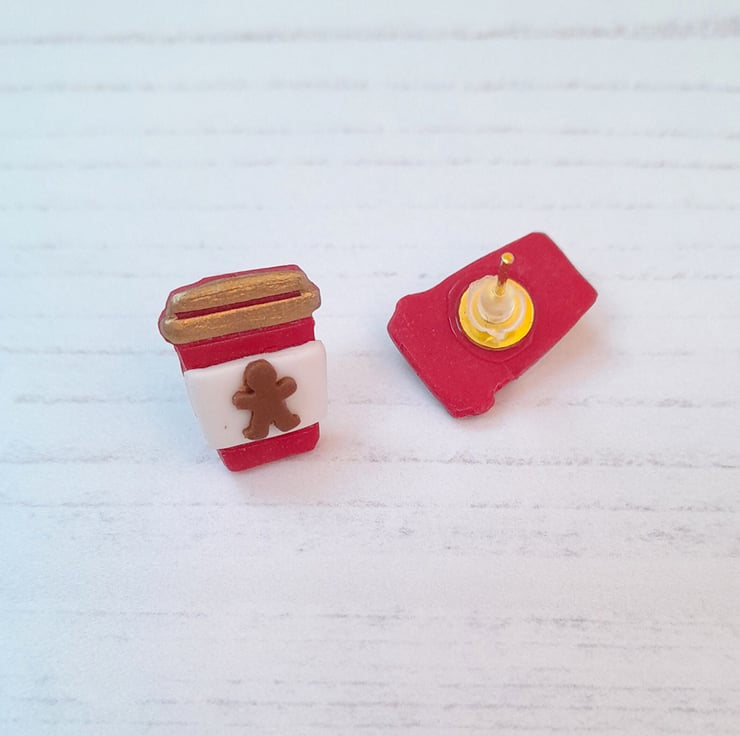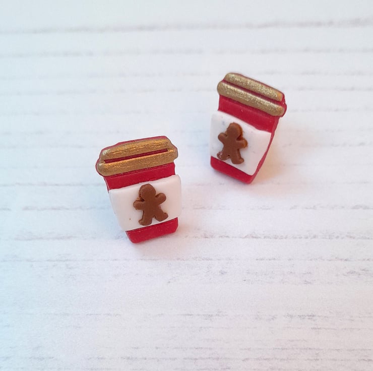 These mini coffee cup earrings have been carefully hand crafted using polymer clay, cut in the shape of teeny tiny travel cups. They have a teeny tiny gingerbread man on the front too!