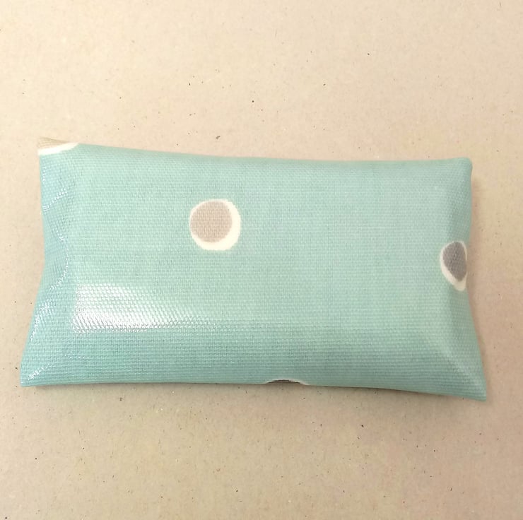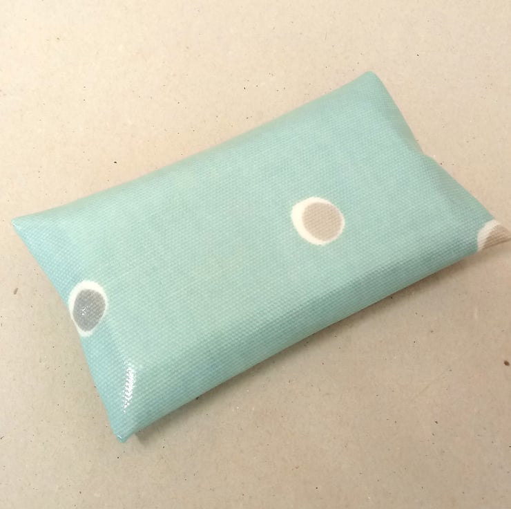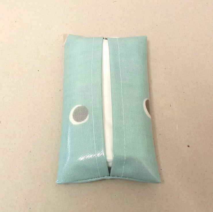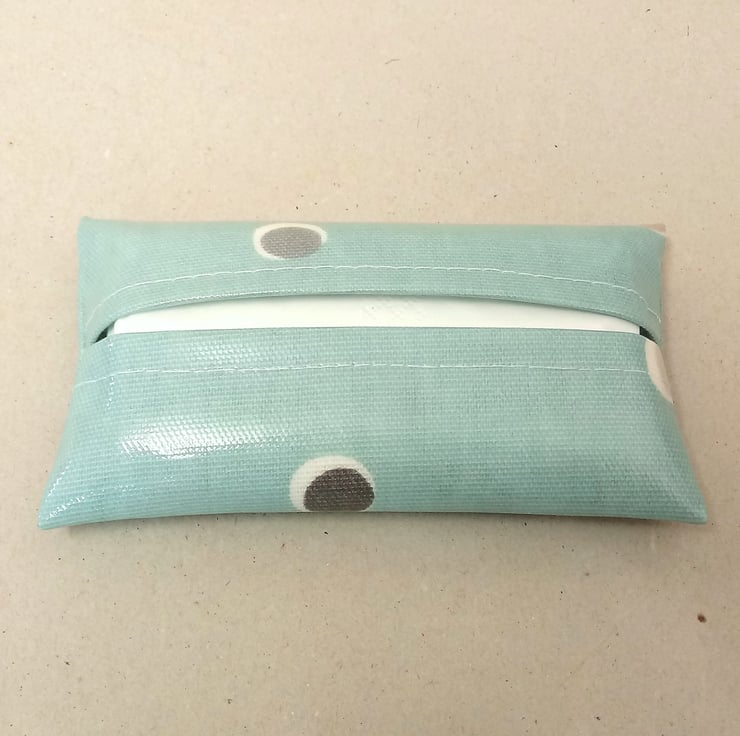 This is a lovely tissue holder, handmade in a pale turquoise oilcloth with grey spots.